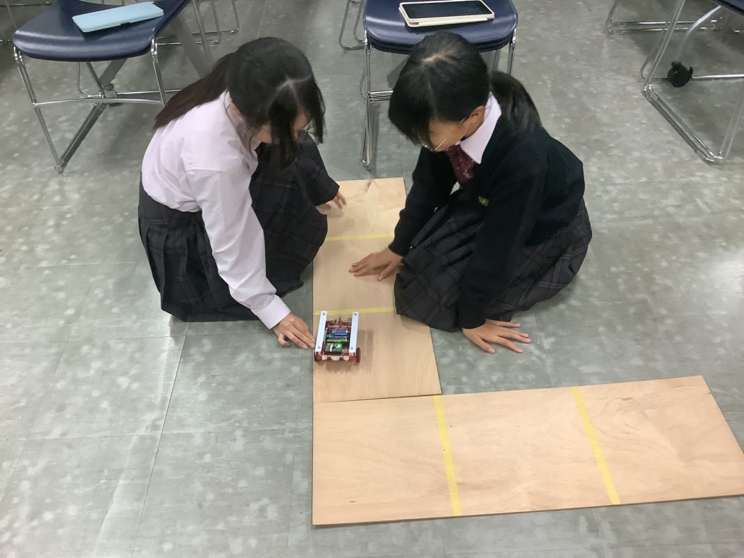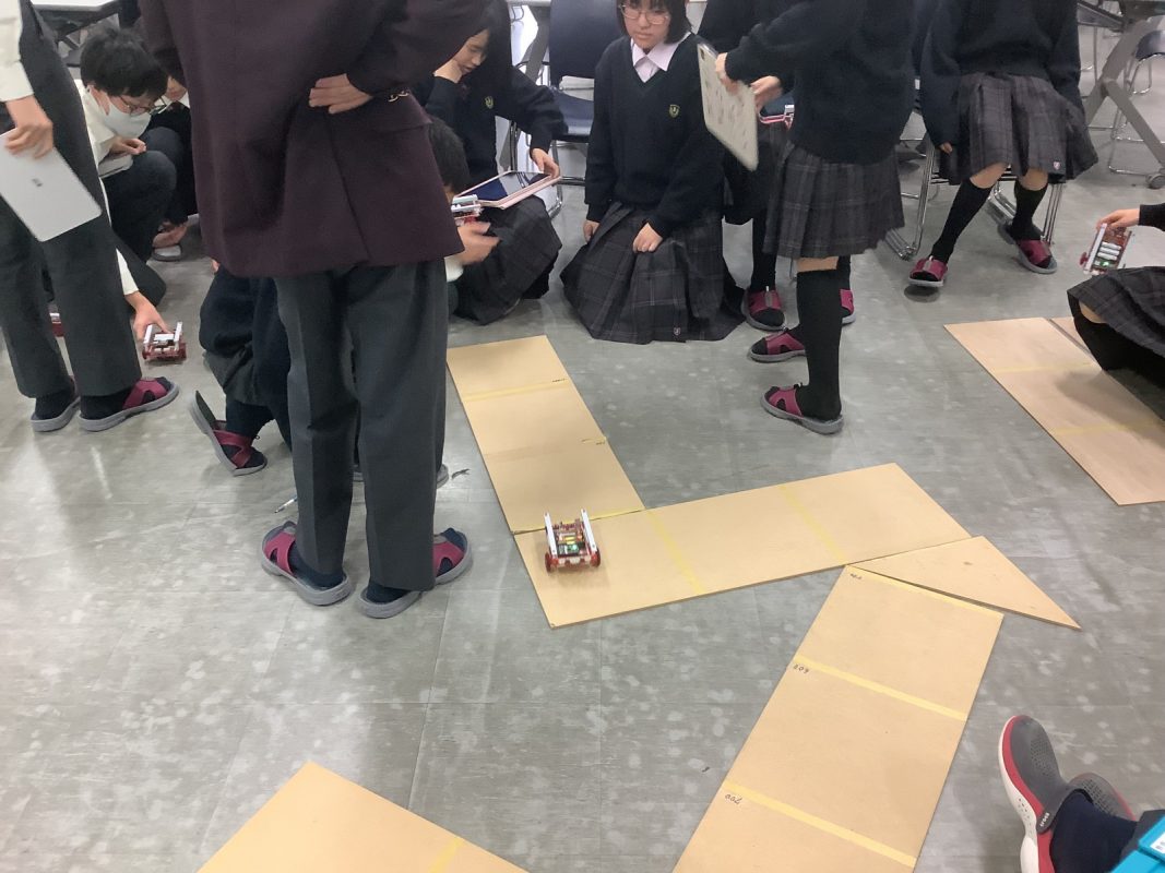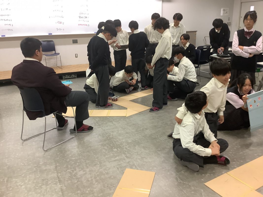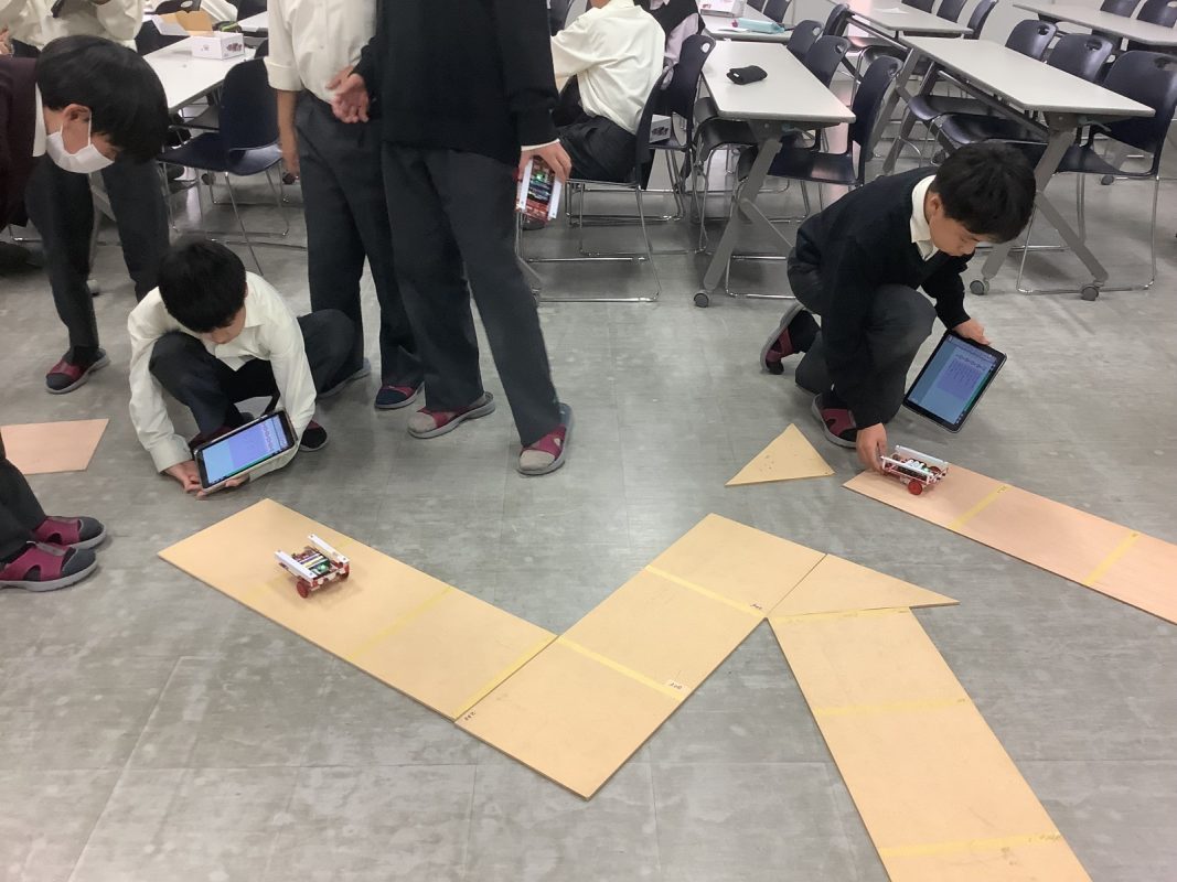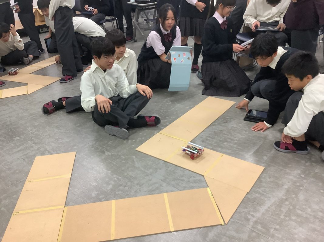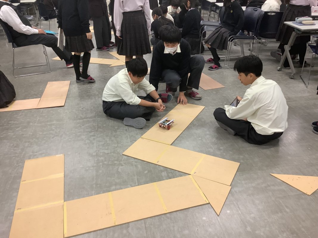 先週1組2組が取り組んだ課題に、今日は3組4組が取り組みました。アメージングチャレンジに挑戦しました。ロボットにプログラムを組んで、板のコースの上を落ちないようにゴールを目指す競技です。国際大会もある有名な競技になります。グループ内で試行錯誤しながら、取り組みました。なかなかうまくロボットが動いてくれなかったり、思い通りに動いた時に喜んだり、さまざまな表情が見られました。