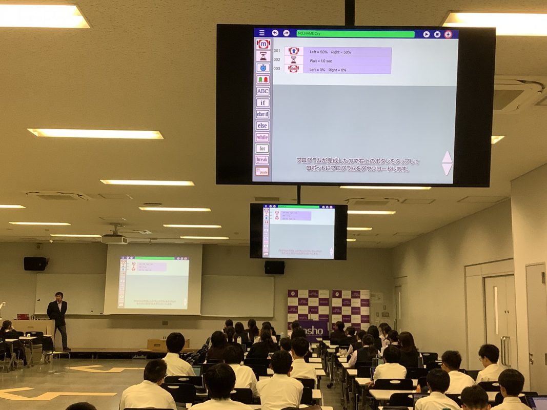 3組4組はプログラミング講座、1組2組はロボット講座を実施しました。