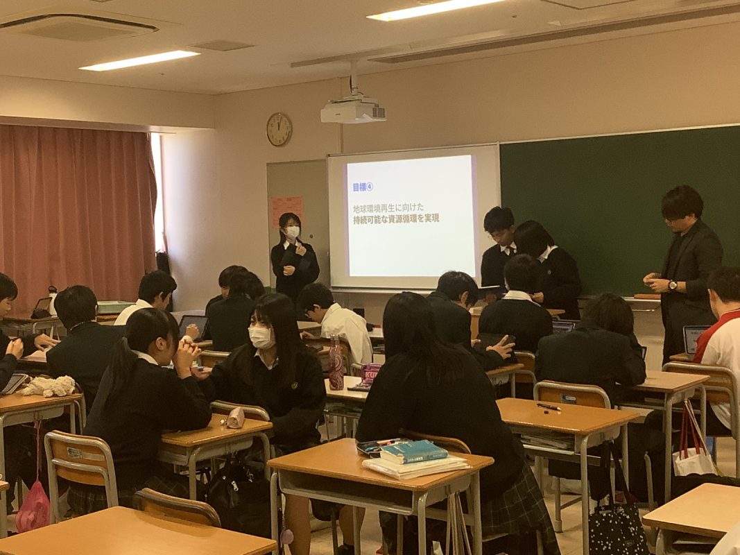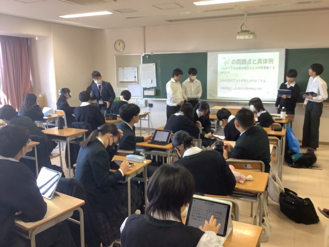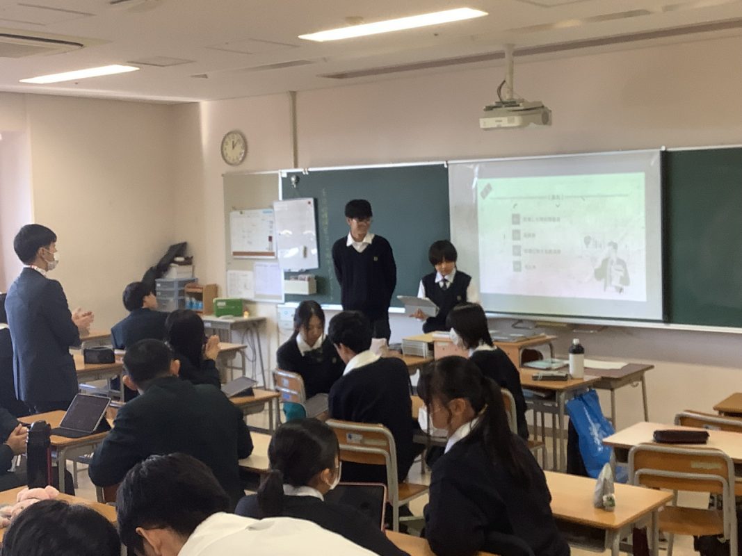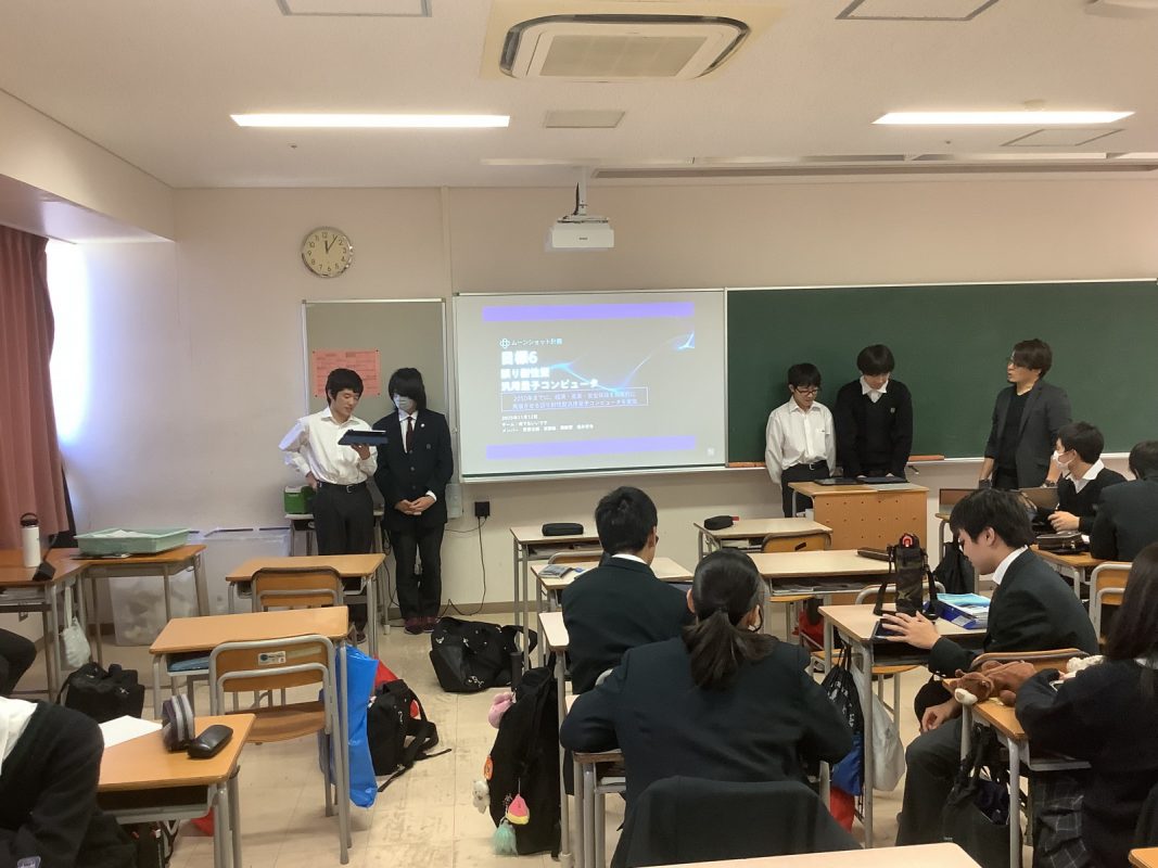 2025年11月8日(土)発表会に向けての最終リハーサルを行いました。1年1組と4組の教室に分かれて,ムーンショット計画の目標1〜10の発表のためのリハーサルでした。発表会場でのリハーサルなので,本番に備えての立ち位置や,スライドチェック,採点方法の確認でした。以下がその様子です。
