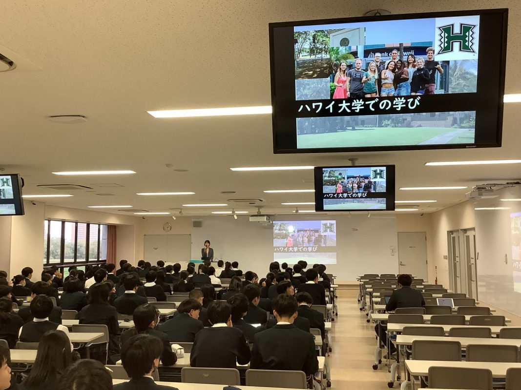2025年11月26日(水)6限の時間帯に事前学習を行いました。行き先の説明,パスポートの取得に関しての説明,を行いました。パスポートは冬休み中心に春休みまでに取得しておく注意をしました。コースによって,ハワイとバリに分かれます。以下はハワイの説明会場の様子です。