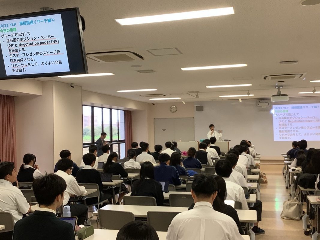 2025年10月22日(水)修学旅行明け,全クラス揃っての久しぶりの授業でした。29日の授業では, 模擬国連のポスター中間発表を行います。その事前準備で,ポスター完成,資料の作成を行いました。