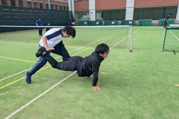 昼からは、テニスコートにてレベル別練習を行いました。気を抜くと番手が下がり、自身のコートで頑張れれば番手が上がる、入れ替えを意識した練習にしました。しんどい時でもグッとこらえて頑張れるかを見ました。