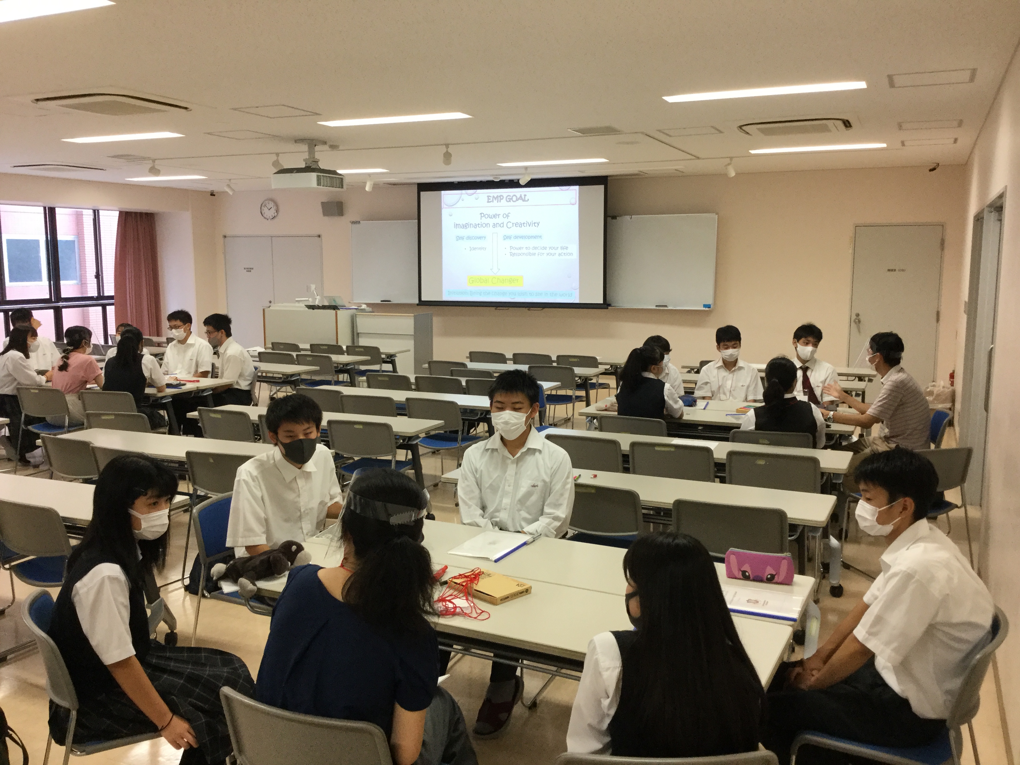 2020年8月18日(火)13時30分から北館3階 第2特別教室で英語エンパワーメントプログラムを行いました。生徒参加者26名に対してネイティブの方は6名、生徒のグループを5チームに分けてネイティブの方が1名ずつ入りました。1名のネイティブの方はファシリテーターで全体の進行を司っていました。生徒たちは皆、英会話を楽しんでいました。18日〜22日の5日間、留学気分を味わいながら、英語のシャワーを浴びます。このレッスン中は、日本語を使わず、英語で会話をします。