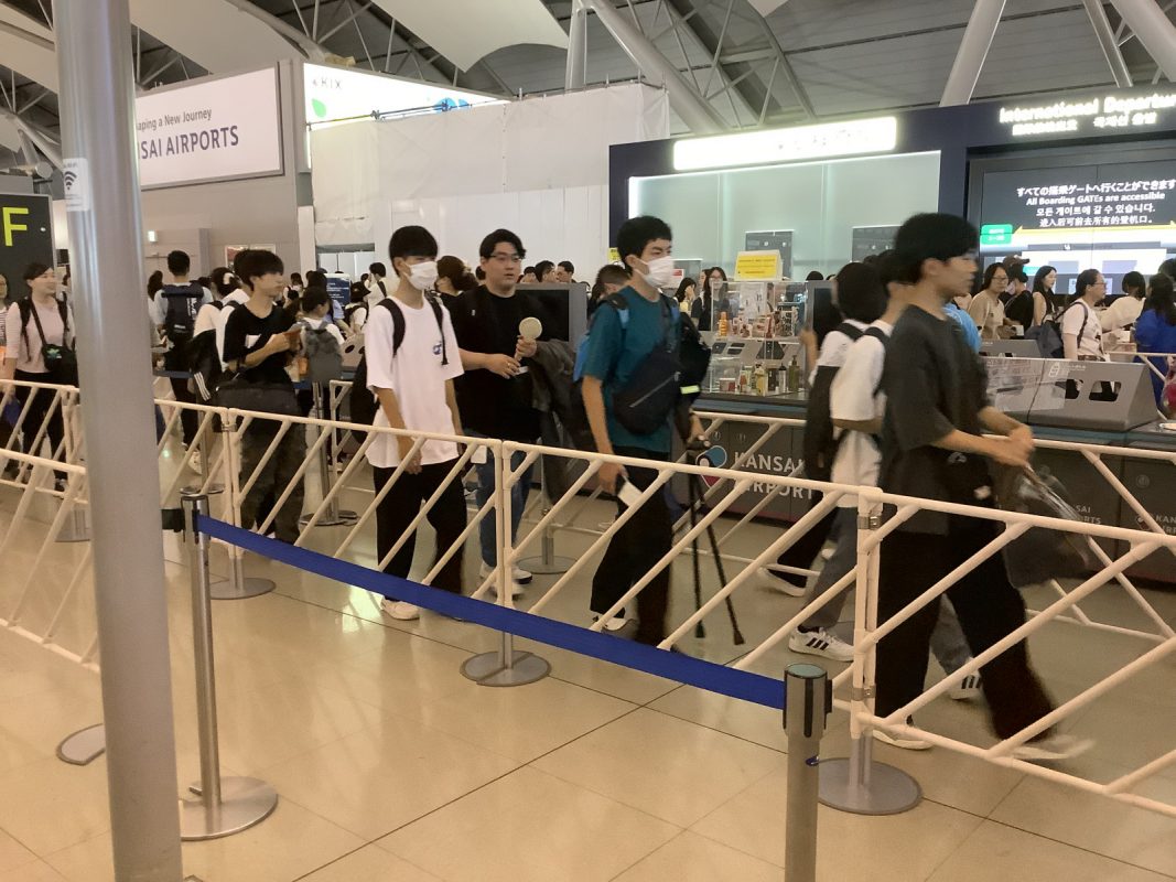 2024年7月28日(日)関西国際空港に15時集合で、30名の生徒が参加しました。14時過ぎから来ている生徒もおり、14時30分を過ぎたあたりで、8割くらいの生徒が国際線 4階 団体受付カウンターに集合していました。揃い次第、集合写真→挨拶諸注意→移動してチェックインでスーツケースの荷物を預けて保安検査場の前で、見送りしました。シンガポール航空のカウンターはとても混雑していました。引率教員2名、添乗員1名で、関空を出発します。以下がその様子です。