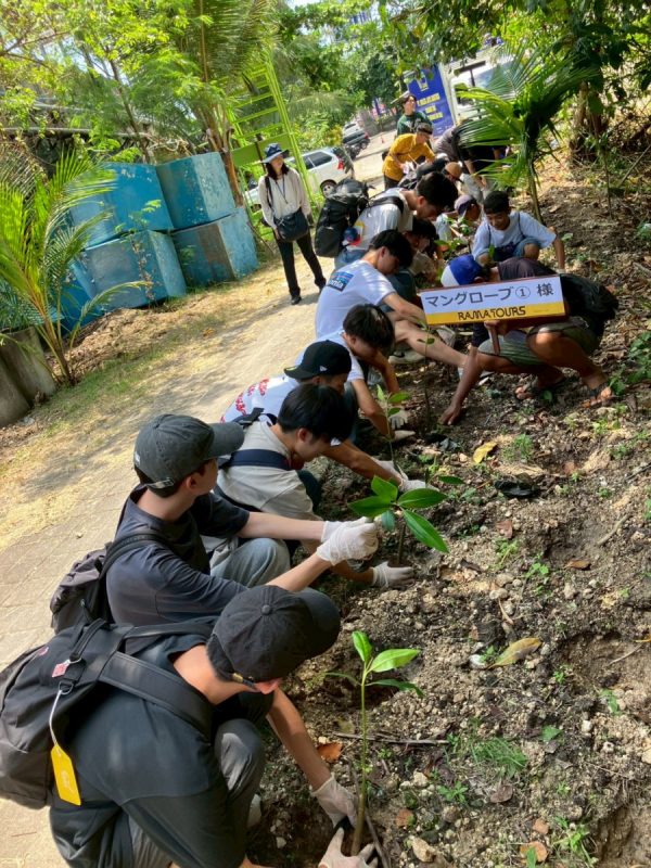Aコース「マングローブの苗づくり・植樹を通して考える」ではマングローブ林に向かい、マングローブの植樹や、カヌーでの稚魚放流を行いました。