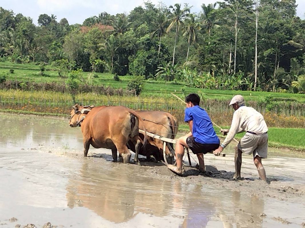 Bコース「バリの奥地で伝統的な農作業体験から学ぶ持続可能性」では、美しい棚田で有名なウブドエリアの農村に出向いて、機械に頼らない伝統的な農法体験として水牛を使った農耕や、手作業での田植え体験、ココナッツツリーアトラクションを行いました。