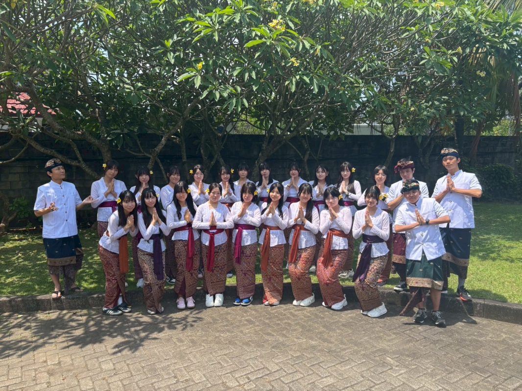 Cコース「バリヒンドゥー教の伝統衣装着用を通して文化の継承を考える」では、伝統文化を重んじるバリヒンドゥー教のお祈りに使う正装を実際に着て、タマンアユン寺院訪問や文化交流を行いました。女性はクパヤというブラウス、サロンという腰布、スレンダンという腰ひもを付けます。男性はサファリシャツというシャツに、サロン、スレンダンを付け、さらにサブッという腰布を巻きます。