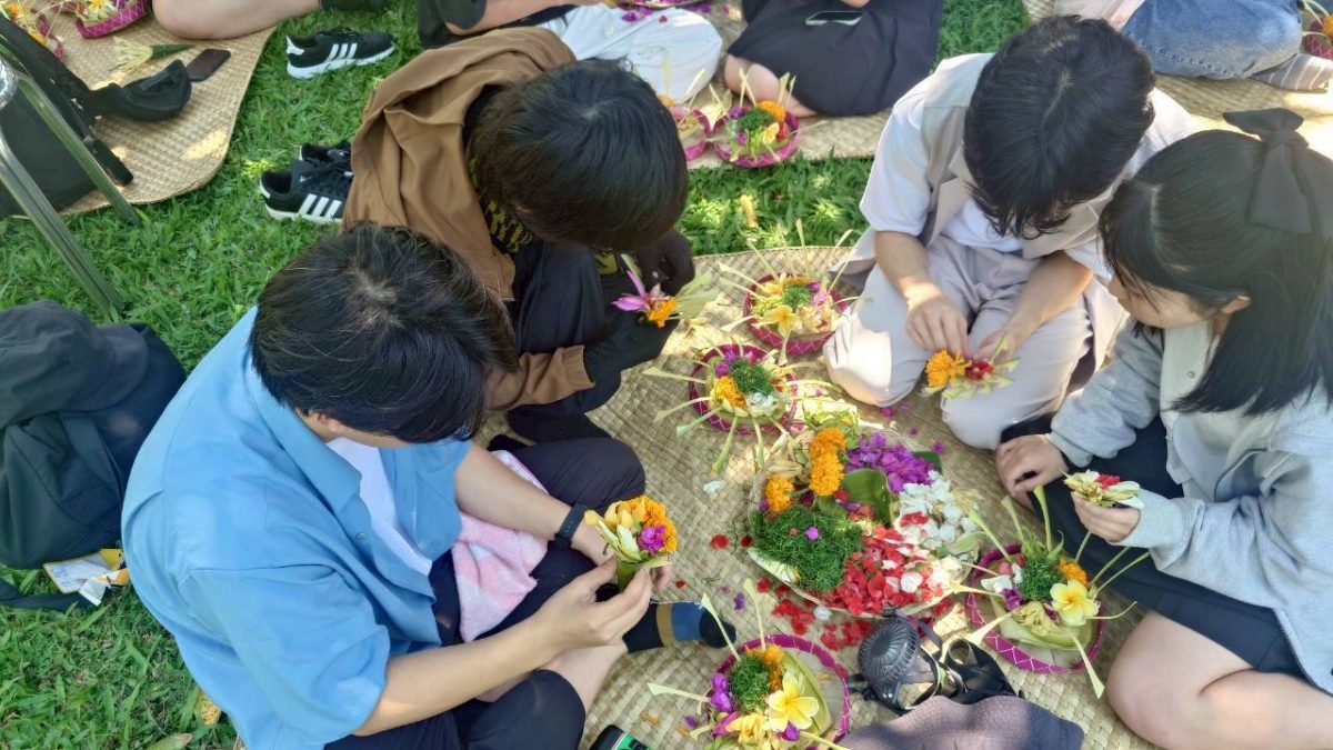 Dコース「毎日のお供え物づくり体験を通してバリ人のライフスタイルの変化を考える」バリではチャナンというお供え物を毎朝手作りして神様に捧げます。バリ島独自で発達したバリ・ヒンドゥー教について現地の方の自宅でバリ島での生活についてのお話を聞き、現地の人々の行動についての知見を深めました。そして実際にお供え物づくりを体験することで、バリの日常の信仰生活、お供え物の意味や信仰心について理解を深めました。