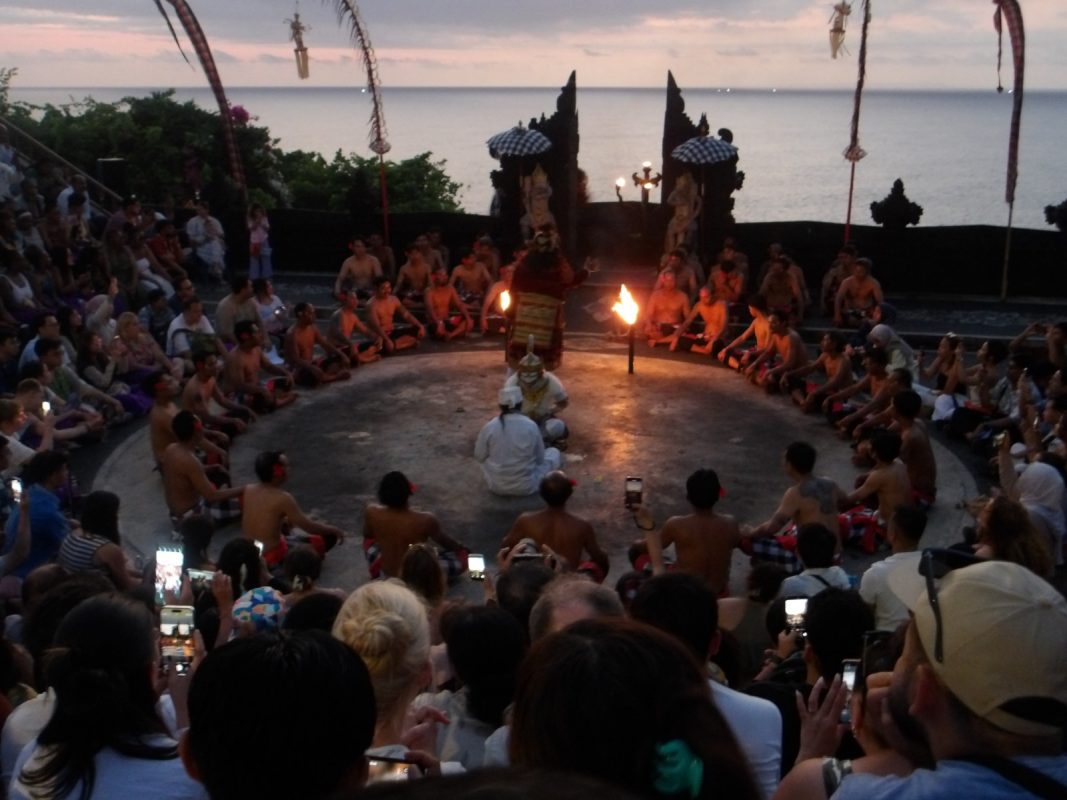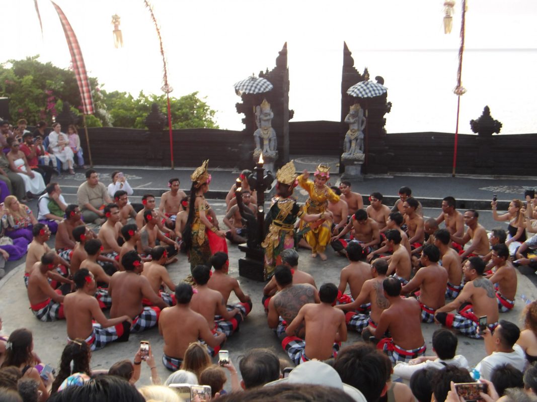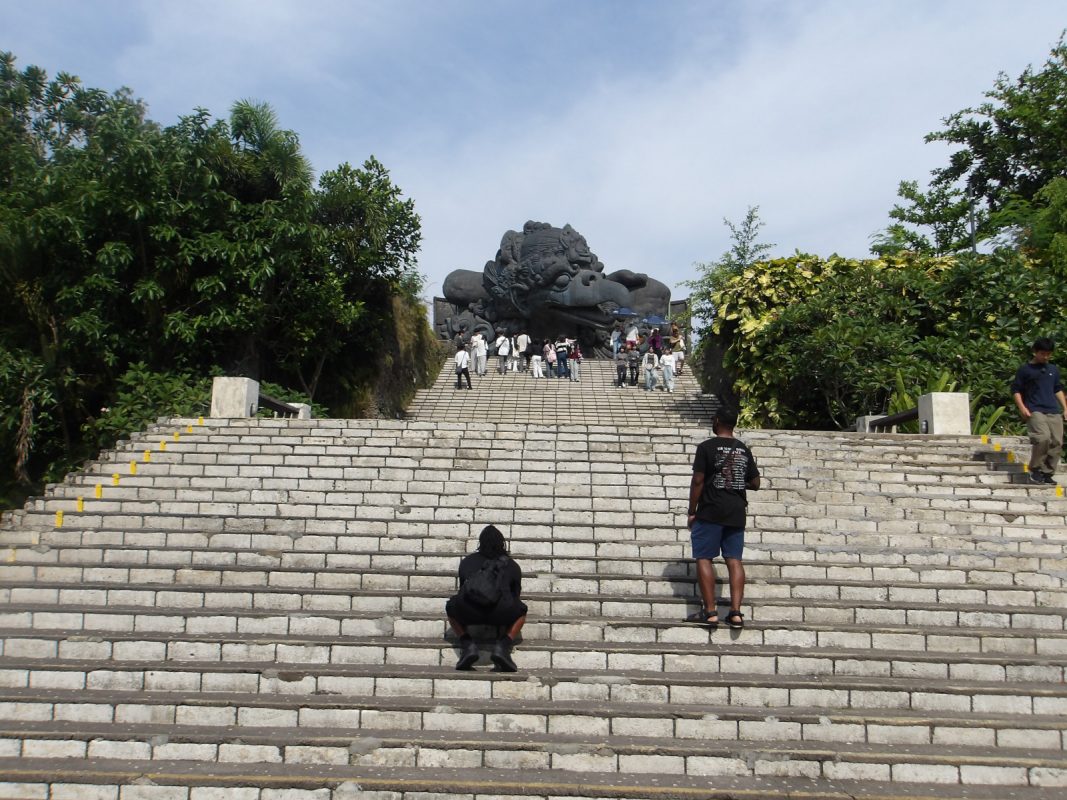 バリコレクションでの昼食後は、14時にホテルを出発し、ヴィシュヌ神をシンボルとするGWKカルチュラルパークということろに寄ったあと、17時頃に有名なウルワツ寺院に到着です。バリ島の観光といえばケチャックダンスが有名ですが、なかでもウルワツ寺院は断崖の上にあるため、大海原や夕日を眺めながらのダンス観賞ということでもっとも人気があります。