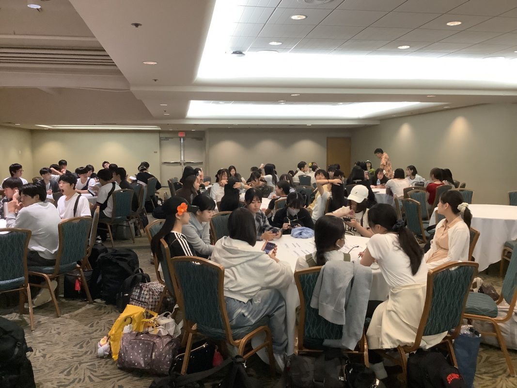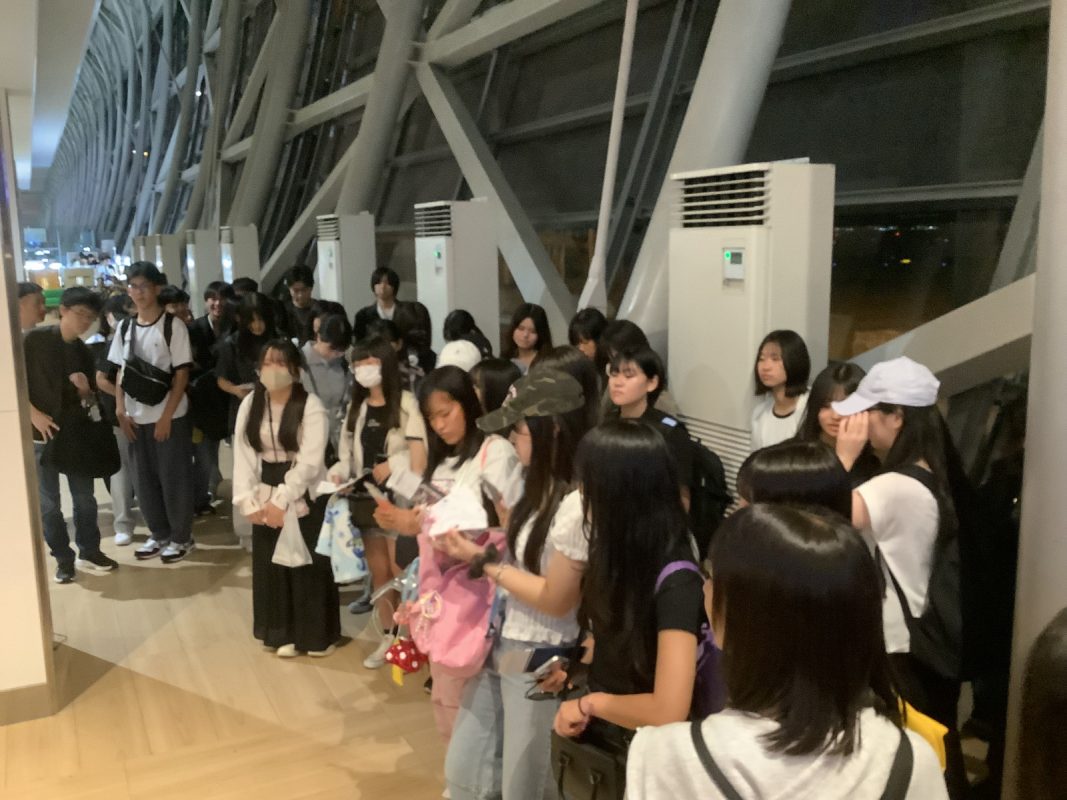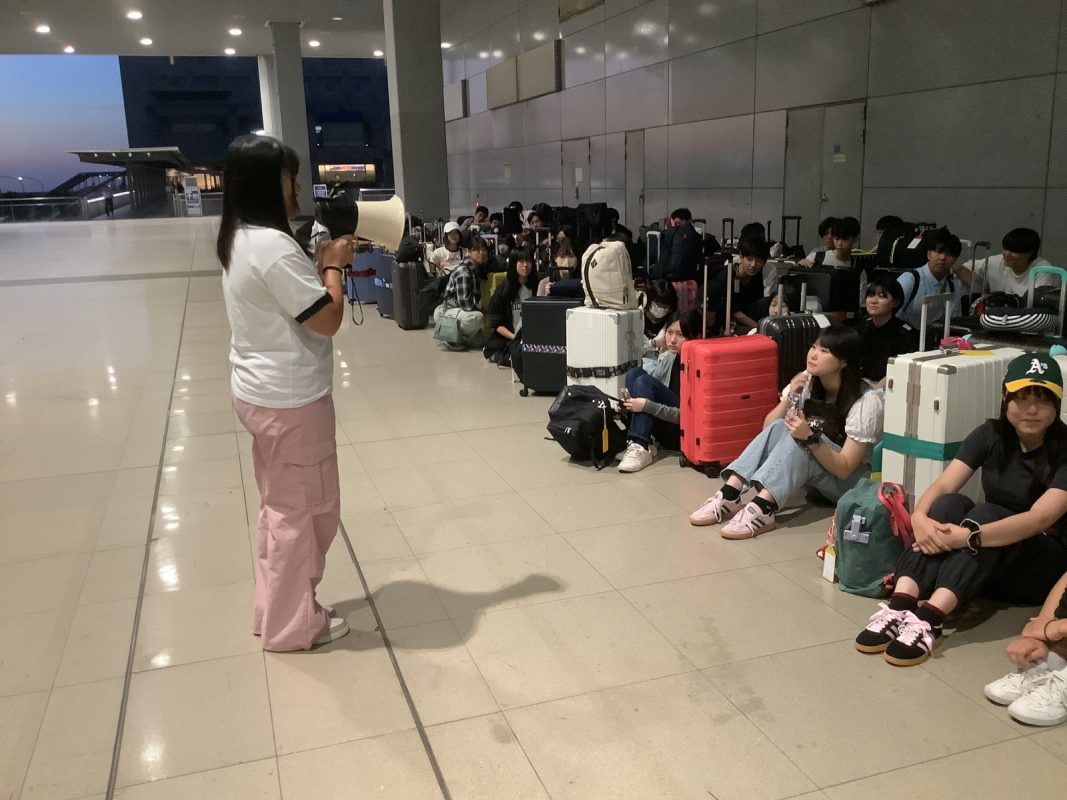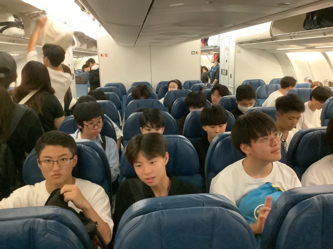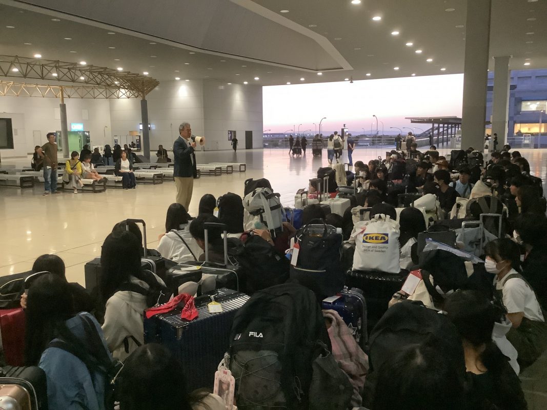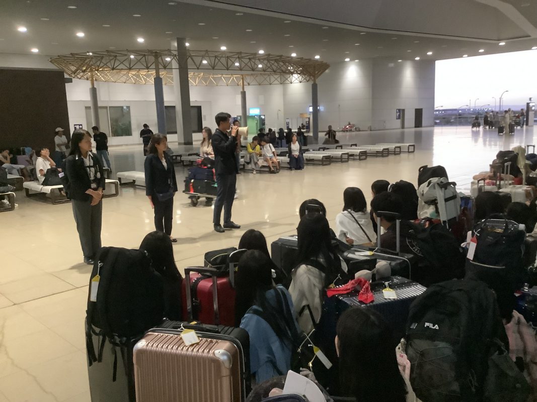 2025年10月6日(月)関西国際空港17時前後から生徒が集まりだし,17時40分には集合完了できました。引率メンバーの紹介の後,校長先生からの一言,続いて旅行社からの諸注意がありました。それから,ゆっくり皆でチェックインカウンターに行きスーツケースを預けて搭乗券を一人ずつ発券されました。新しくなった保安検査場を通過,搭乗口に行くまでに約1時間かかりました。搭乗口近くで,40分程度自由時間がありました。ペットボトルなど購入する生徒もいました。