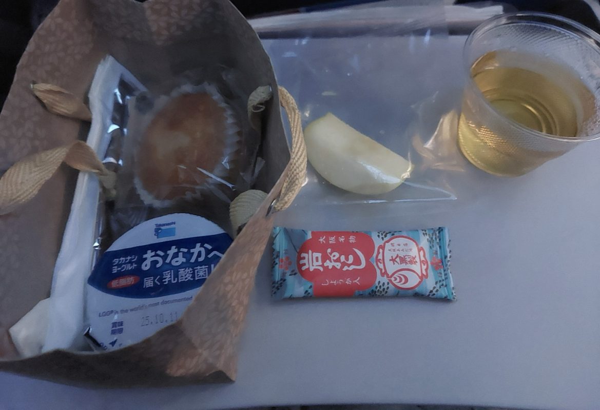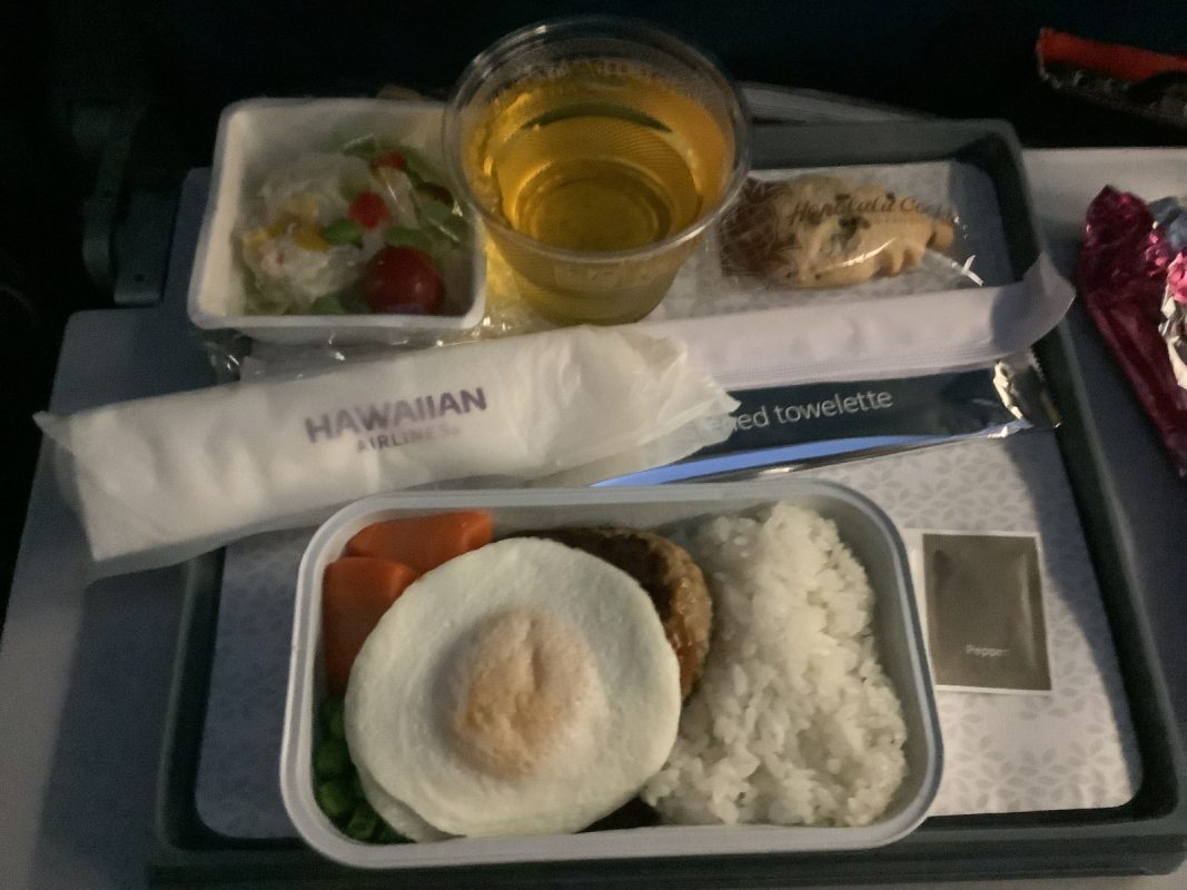日付変更線を通過するので,現地ハワイのホノルル ダニエル・K・イノウエ国際空港に6日の朝,9時50分くらいに着陸予定です。朝食はハワイ時間で,6日の朝8時30分頃に配食されました。