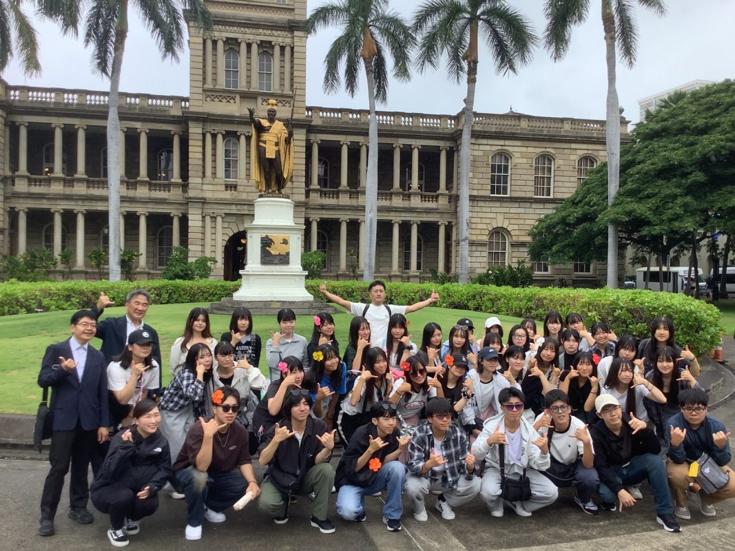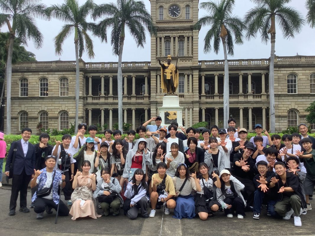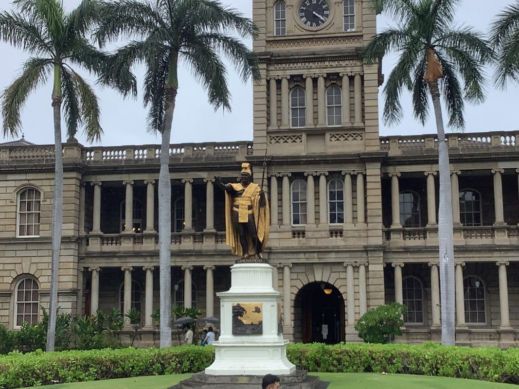 13時15分にカフェジュリアを出発して,13時20分にイオラニ宮殿前のカメハメハ大王像で集合写真を撮りました。