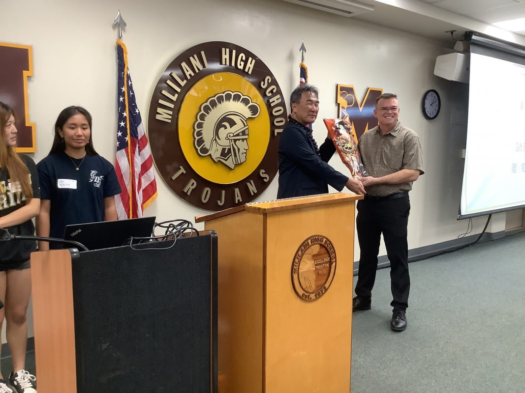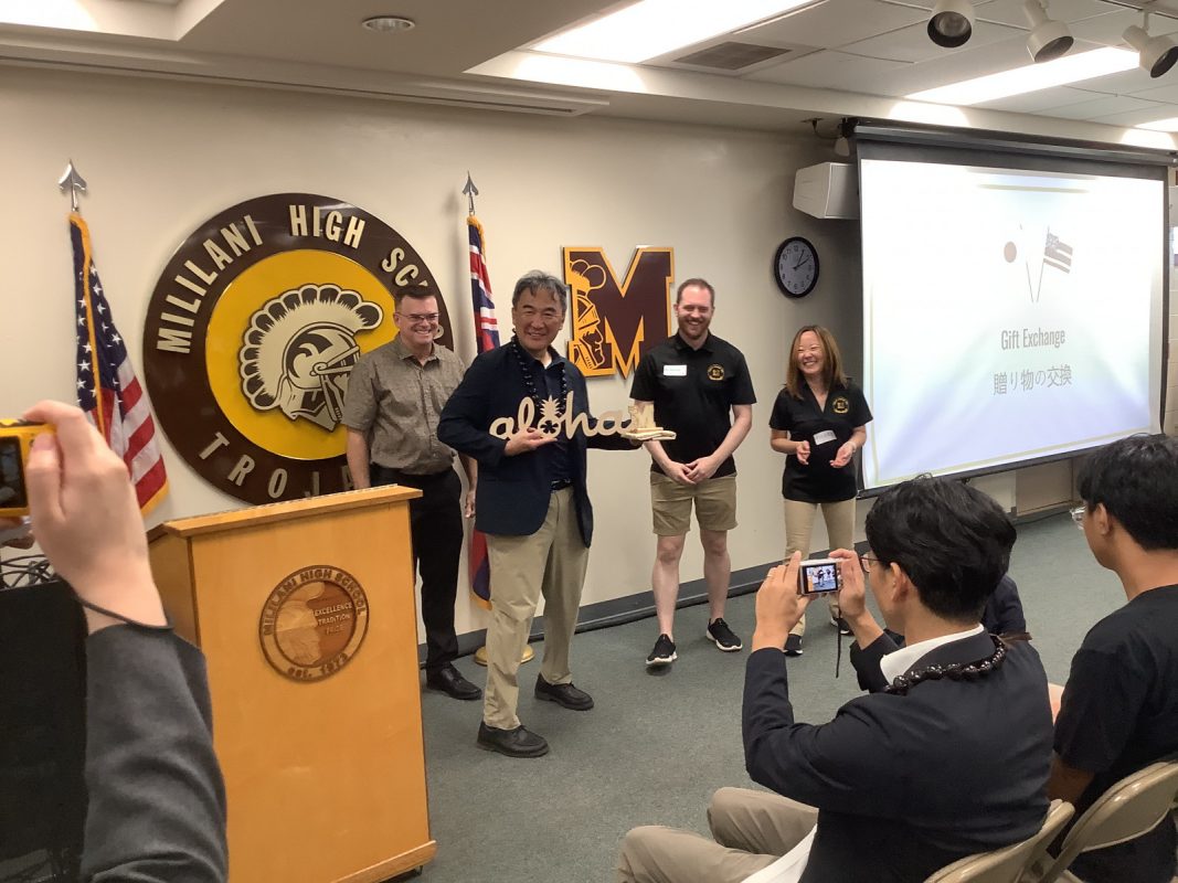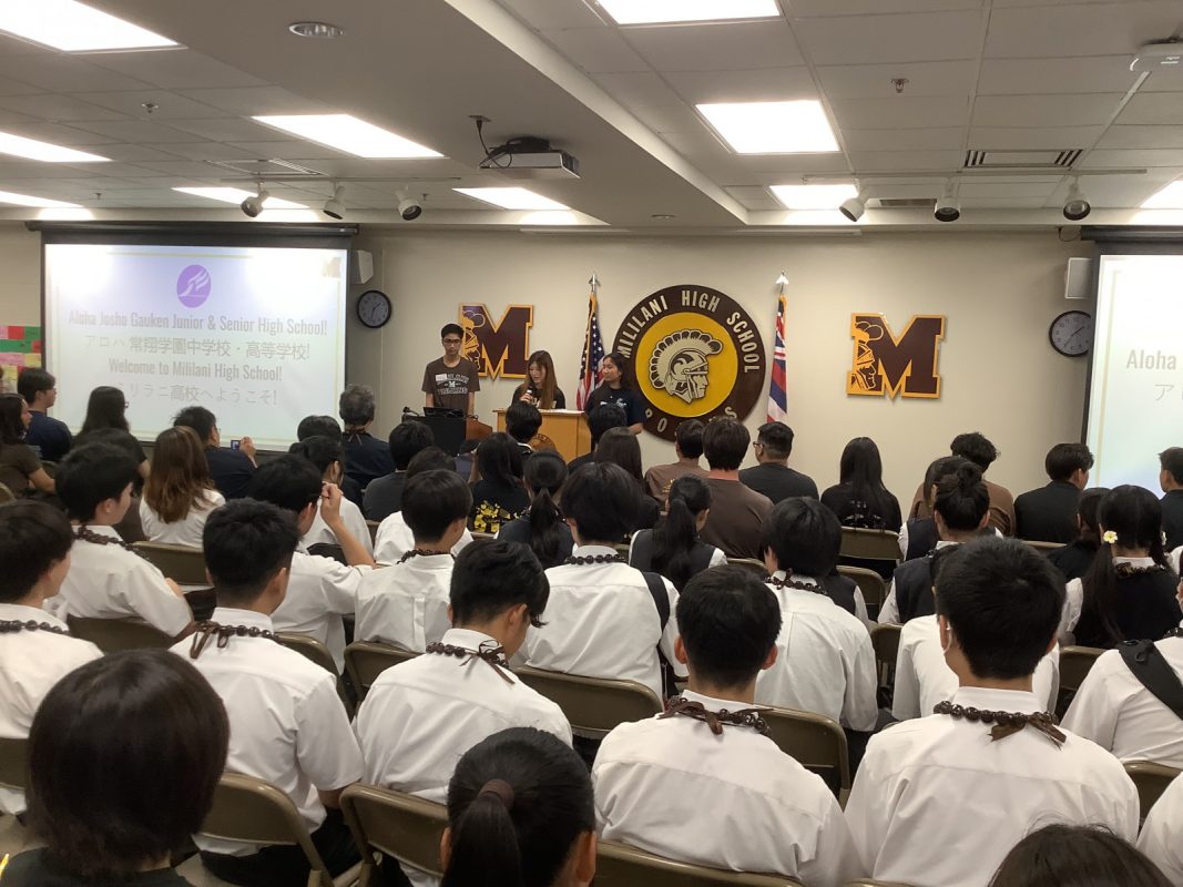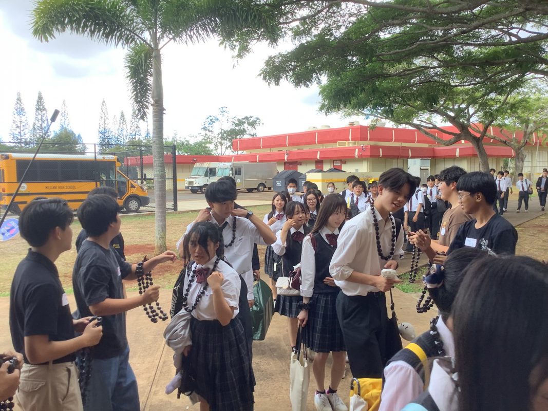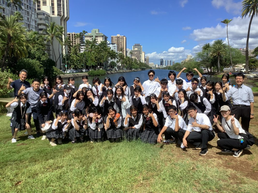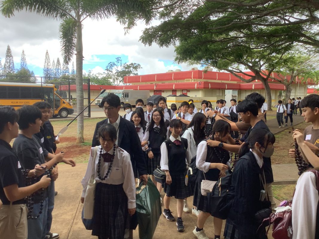 2025年10月7日(火)生徒たちは,それぞれホームステイ先で一晩過ごしました。初めての経験の生徒も多く,良い刺激のになったことでしょう。アラワイ運河に集合ですが,ホストファミリー宅から車で送ってもらいました。各ご家庭の都合もあり,8時から9時の間に27家庭に分かれて過ごした生徒たちが,集合しました。プログラムの準備も生徒が手伝ってくれて,9時20分頃から運河のヘドロを浄化させるボランティア活動のプロジェクトをはじめました。まず,ハワイの神様に捧げるお祈りを皆さんで円陣を組んで行いました。その後,泥団子の製作を行いました。砂に米糠と水を浄化させる細菌を含む液体で練って泥団子を作りました。泥団子は3週間くらいかけてボールのように硬くなります。生徒全員で,800個近く製作しました。10時半ごろには仕上がり,いよいよ運河に向けて乾燥した泥団子,通称ゲンキボールを一人一人投げ入れて楽しんでいました。この行為そのものが,環境にやさしいプロジェクトで,少しボランティア活動のお手伝いを常翔学園生が行ったことに地域貢献できた喜びが有りました。集合写真を撮り,昼食は配達してもらったお弁当を芝生の上で食べました。11時10分には早い昼食,11時40分にはバスの配車で,11時50分にはミリラニ高校に向けて出発しました。午前中の活動は以下の写真です。