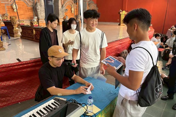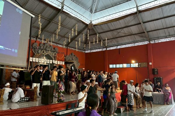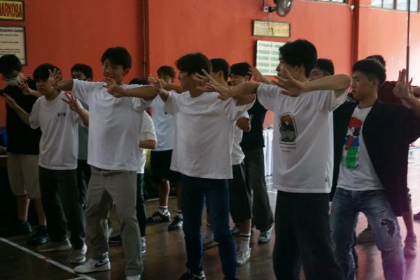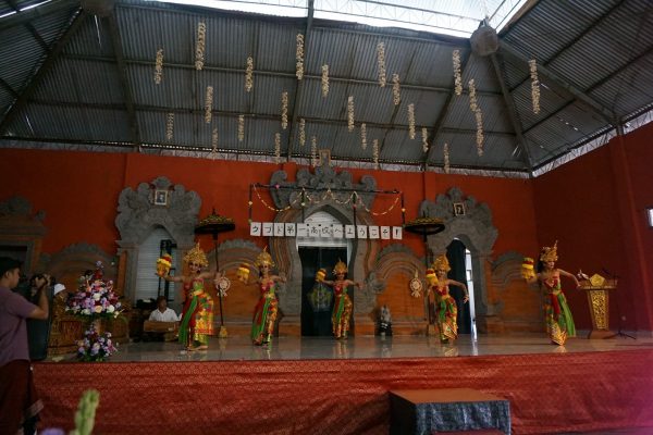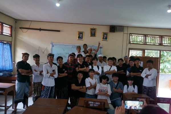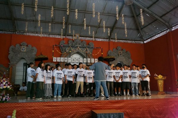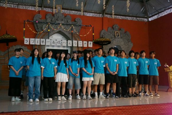 学校交流第1部として、両校代表教員の挨拶と本校からも生徒代表スピーチを行いました。その後両校のパフォーマンスを行いました。11組と15組は歌の合唱、16組はダンスを行いました。どれもクラスの特徴を発揮した素晴らしいパフォーマンスとなりました。特に16組のダンスでは途中からウブド第一高校の生徒も一緒に踊り、とても盛り上がりました。