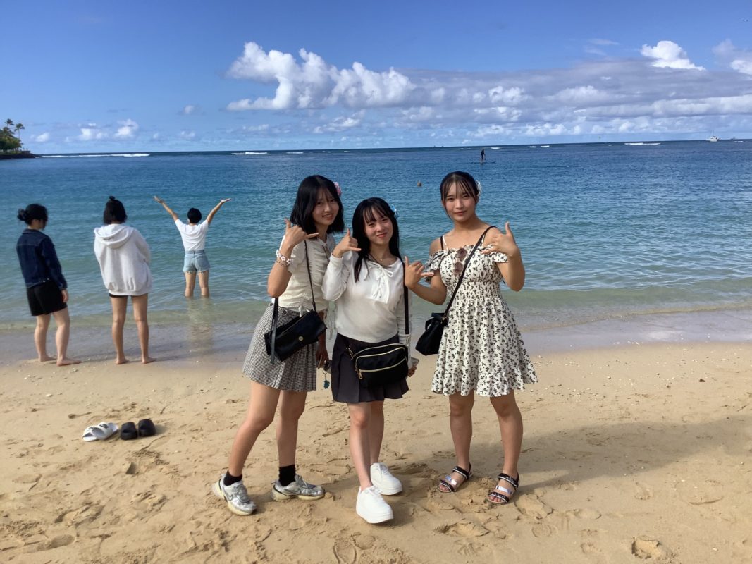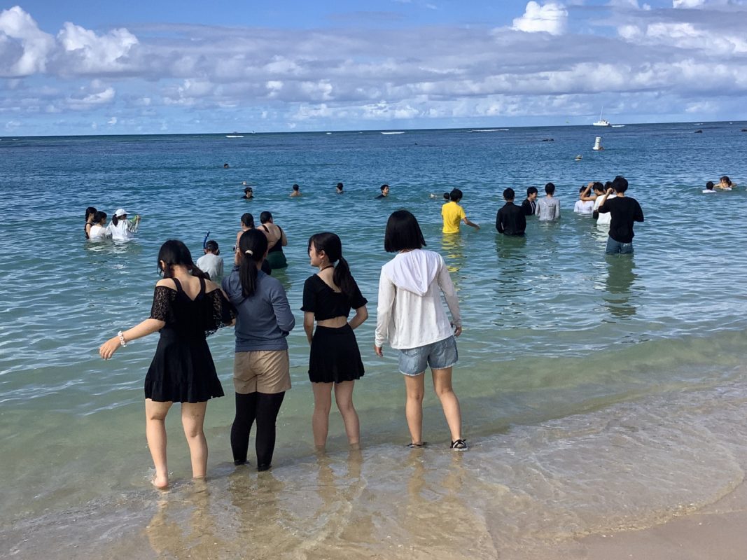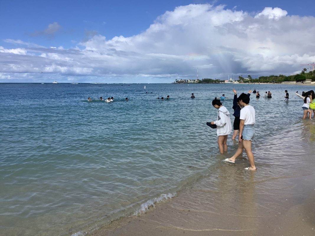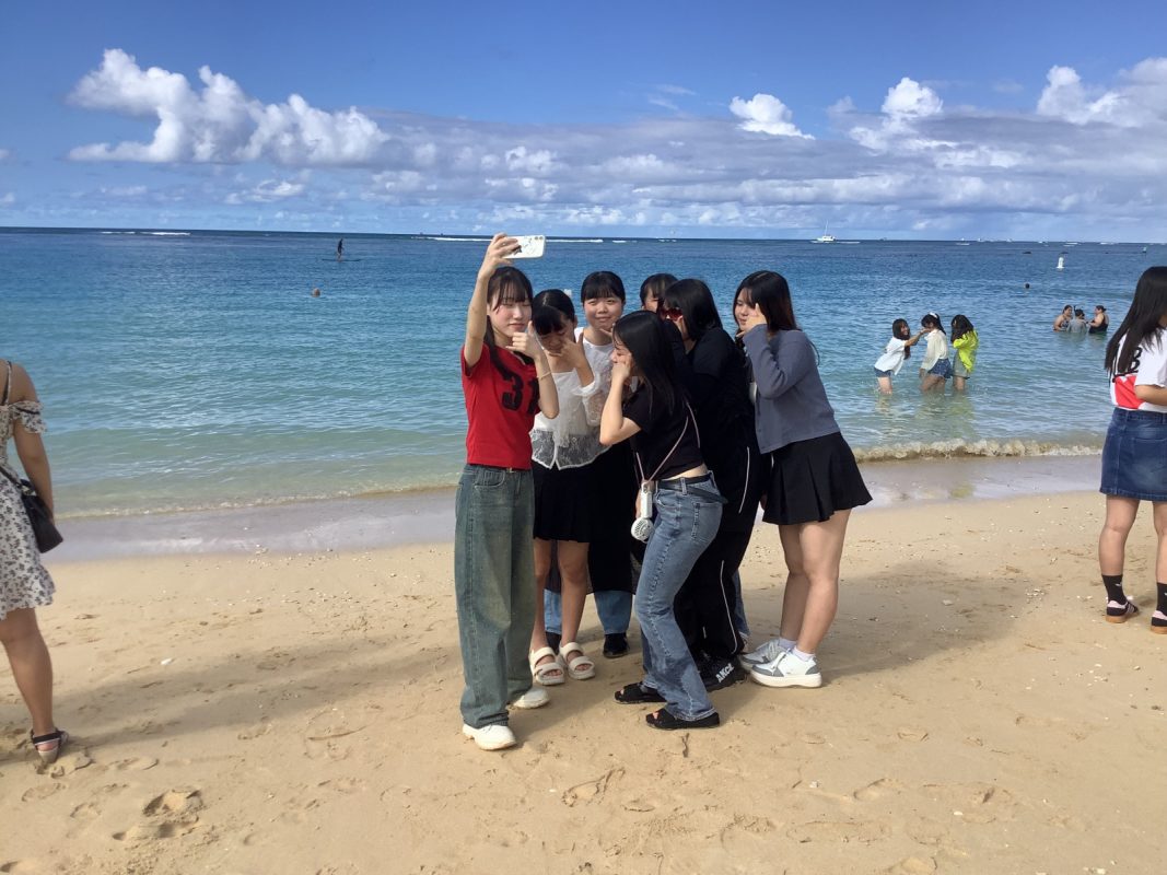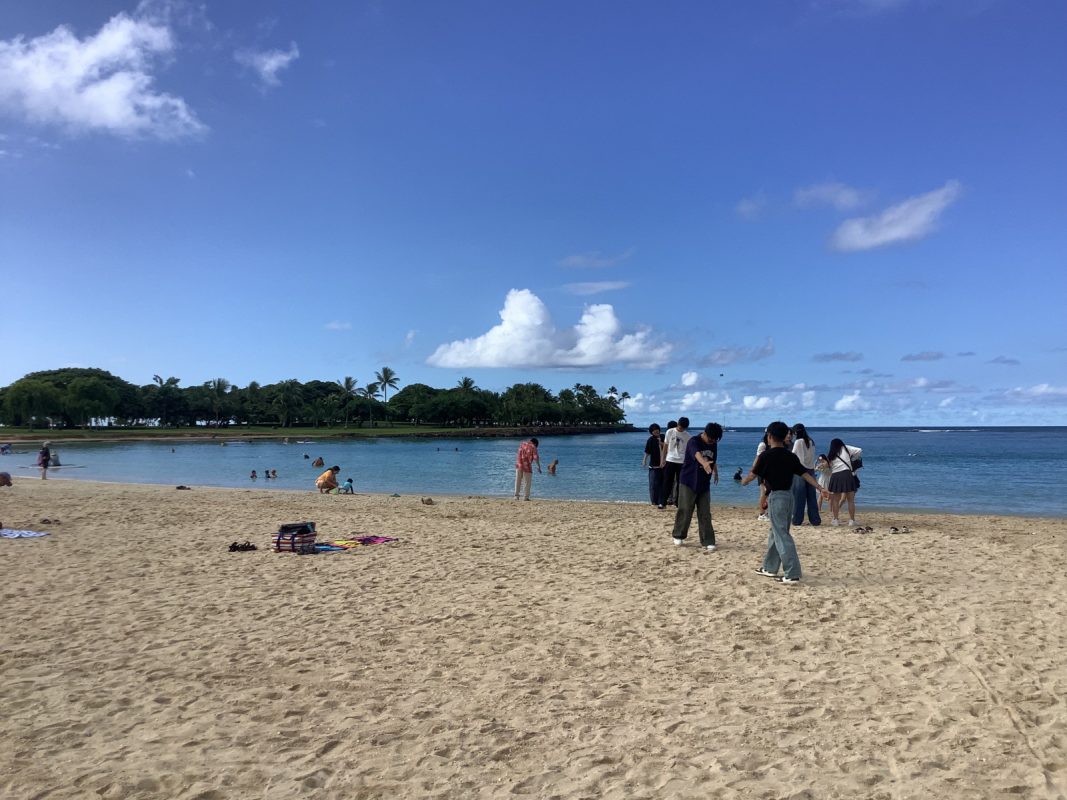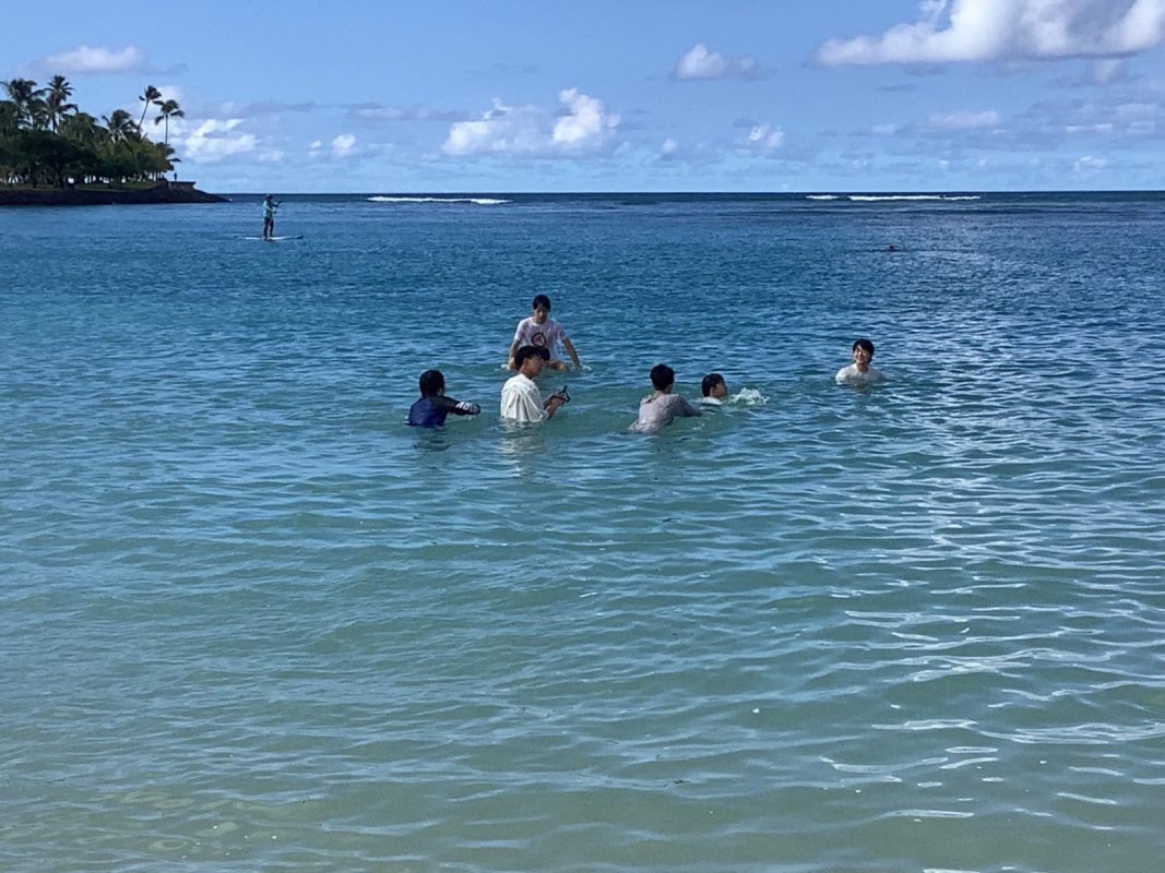 2025年10月9日(木)ハワイを一日満喫できる日,朝7時起床後,自室での自由食(前日に購入済み)を各自食べました。アラモアナビーチで泳ぐ生徒は水着の準備,見学の生徒は軽装で、全員で8時30分頃,アラモアナホテルからアラモアナビーチまで,歩いて15分くらいで到着しました。まず集合写真をクラスごとに撮影して,それから海で泳ぐグループ,見学するグループに分かれました。9時前から10時30分頃まで,自由に泳いでいました。泳がないグループは,午後の班別自主研修を午前中から開始しました。泳いだグループは,一度ホテルに戻り,自室でシャワーを浴びて服に着替えてに11時30分頃それぞれのグループで,ワイキキ方面、アラモアナ周辺など計画しているところへの移動を開始しました。17時までにアラモアナホテルに戻りました。夕食は,アラモアナホテル近くの中華レストランに皆んなで行きました。