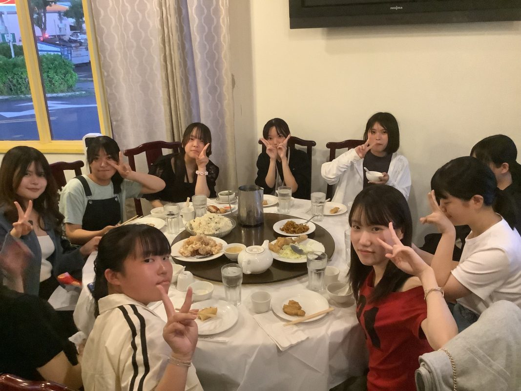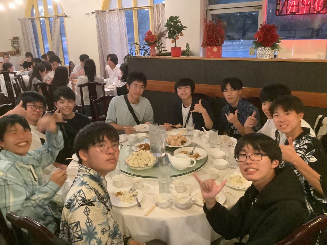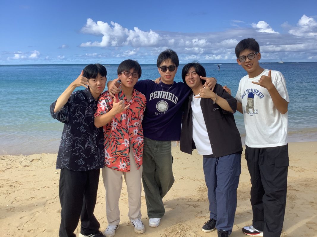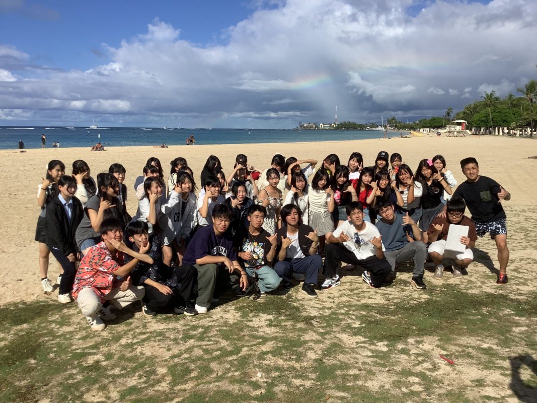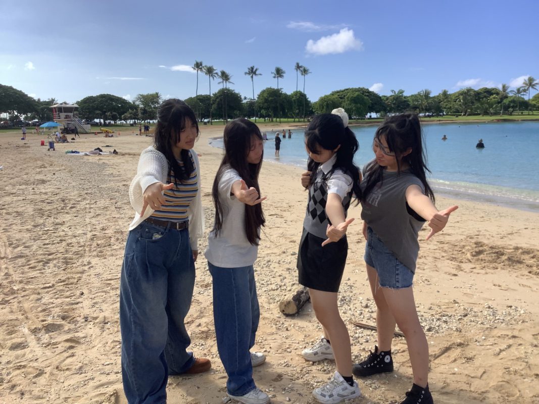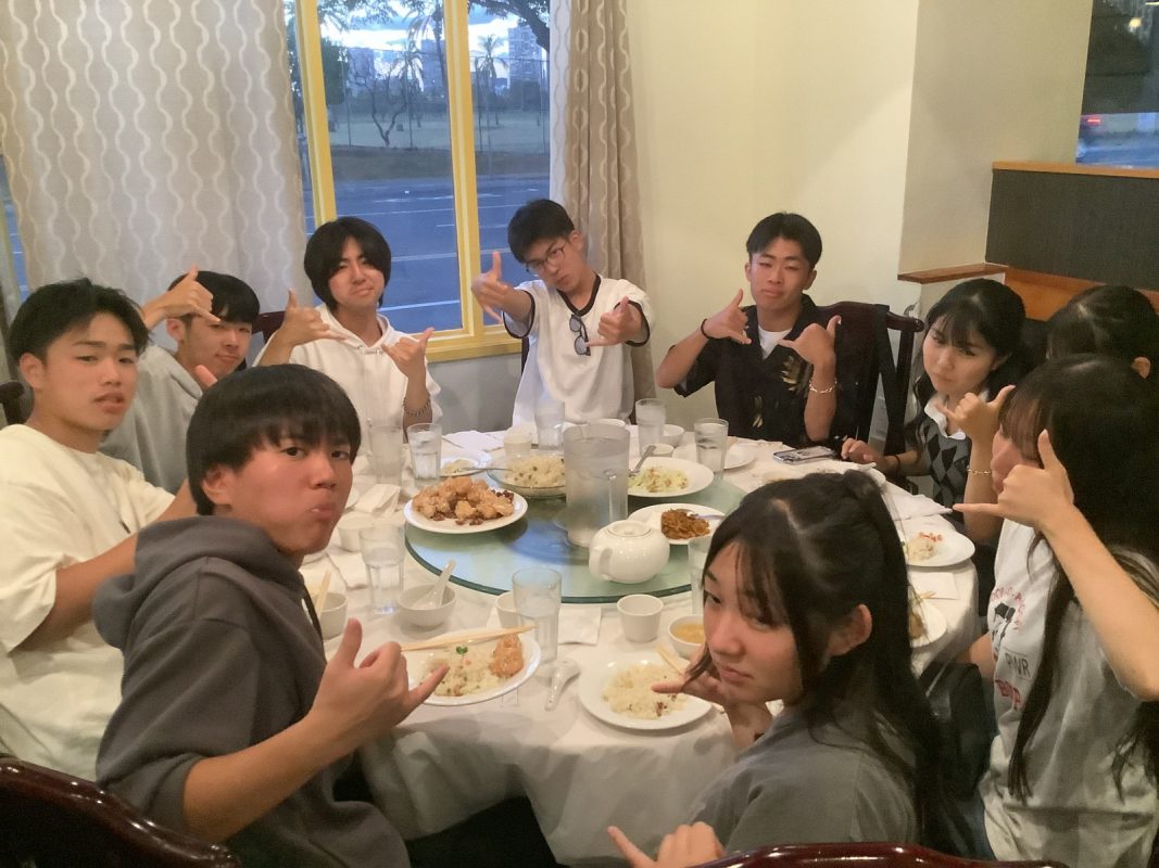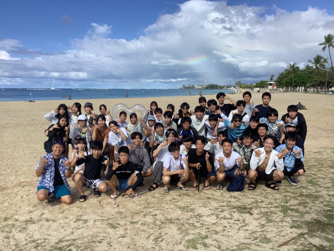 2025年10月9日(木)ハワイを一日満喫できる日,朝7時起床後,自室での自由食(前日に購入済み)を各自食べました。アラモアナビーチで泳ぐ生徒は水着の準備,見学の生徒は軽装で、全員で8時30分頃,アラモアナホテルからアラモアナビーチまで,歩いて15分くらいで到着しました。まず集合写真をクラスごとに撮影して,それから海で泳ぐグループ,見学するグループに分かれました。9時前から10時30分頃まで,自由に泳いでいました。泳がないグループは,午後の班別自主研修を午前中から開始しました。泳いだグループは,一度ホテルに戻り,自室でシャワーを浴びて服に着替えてに11時30分頃それぞれのグループで,ワイキキ方面、アラモアナ周辺など計画しているところへの移動を開始しました。17時までにアラモアナホテルに戻りました。夕食は,アラモアナホテル近くの中華レストランに皆んなで行きました。