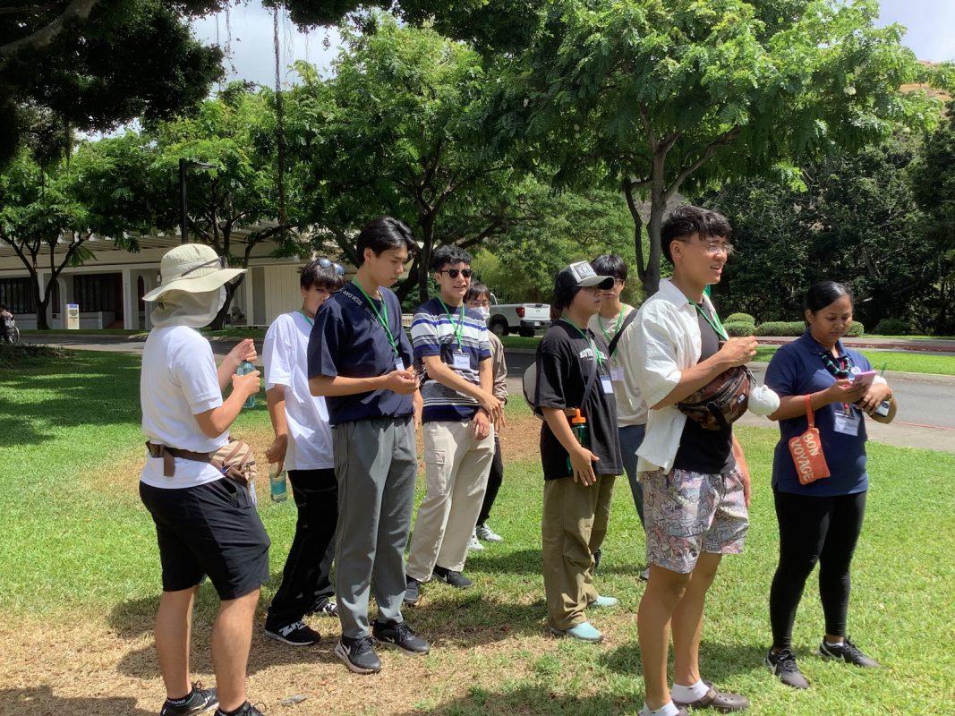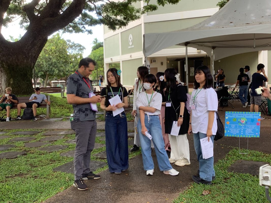 午後は、ICTを活用したミッションハントに挑戦。大学構内を巡りながら、・指定ポイントでの記念撮影、・「○○をハワイ語で言うと?」といったクイズ、・大学生への英語インタビュー(①出身国 ②専攻 ③日本の印象)などのミッションをこなしました。学びと発見に満ちたプログラムで、約5時間半の滞在があっという間に感じられるほど充実した時間となりました。ハワイ大学の皆さまに心より感謝いたします。