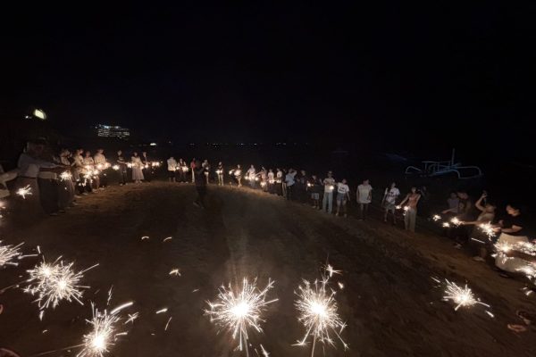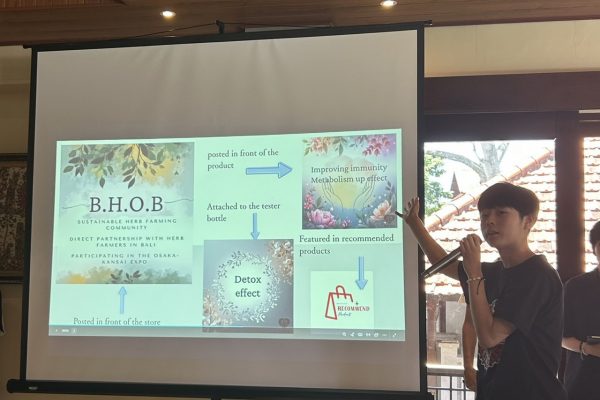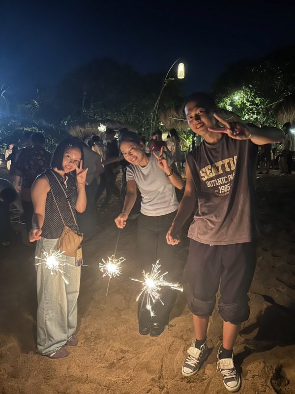 本日はMoGの最終日で、午前中に各企業の社長さんに向けての最終プレゼンがありました。そのため、各グループ自発的に朝8時から集合し、英語でのプレゼン発表のために練習していました。そしていよいよ本番の時。社長さんを目の前にすると緊張感が一気に高まります。不慣れな英語で社長さんの心に響くプレゼンができるのか不安そうな生徒もいました。ただ、緊張とは裏腹にプレゼンは見事なものでした。台本を覚えきる時間は少なかったものの、できるだけ顔を見て話そうとする姿、各企業に本気で何かを提案したいという気持ちのこもった内容・調査活動、そして終えた後の質疑応答に対する答えなど、ここに来るときには見られなかった生徒の姿を見ることができました。そしてそのプレゼンを見た社長さんがみんな嬉しそうにしていたこともとても印象的でした。このMoGの取り組みは大変なものでしたが、この光景がみられただけでも非常に価値があったかと思います。そして、MoGのすべてのプログラムが終了し、ファイナルチェックアウトの時間。この1週間ともに頑張ってきた仲間の言葉と支えていただいたメンターさんからの最後の言葉。コメントを聞いているとそれぞれにやりがいや成長がみられてとても誇らしかったです。達成感やグループのメンバー、メンターさんと離れることへの寂しさからなく生徒も続出しました。それだけ本気で取り組んできた証拠だと思います。メンターさんからの熱い言葉もあり、生徒の胸には深く刺さったことでしょう。その後教員からも一言話させていただきましたが、教員も一言いわさせていただきましたが、生徒たちの成長に感涙しました。ここまでクラスで積み上げてきたものへの時間やこだわりをとても感じました。根来校長補佐からの熱い言葉もあり、この修学旅行を帰ってから振り返ってくれることでしょう。その後はサヌールへ移動し、大型ショッピングセンター「Icon Bali」で自由散策を行いました。お土産をたくさん買う生徒、少し休憩する生徒、ショッピングを楽しむ生徒と様々で、とても楽しそうでした。ディナーはすぐ近くのビーチでありました。メンターさんとの最後のご飯なので、それぞれ自由な席でメンターさんを囲んでピザやポテトを楽しみました。そしてその後は、サプライズで花火大会!!Very50さんがこの日のために大量の花火を用意してくださり、みんなでバリ最後の夜を楽しみました。