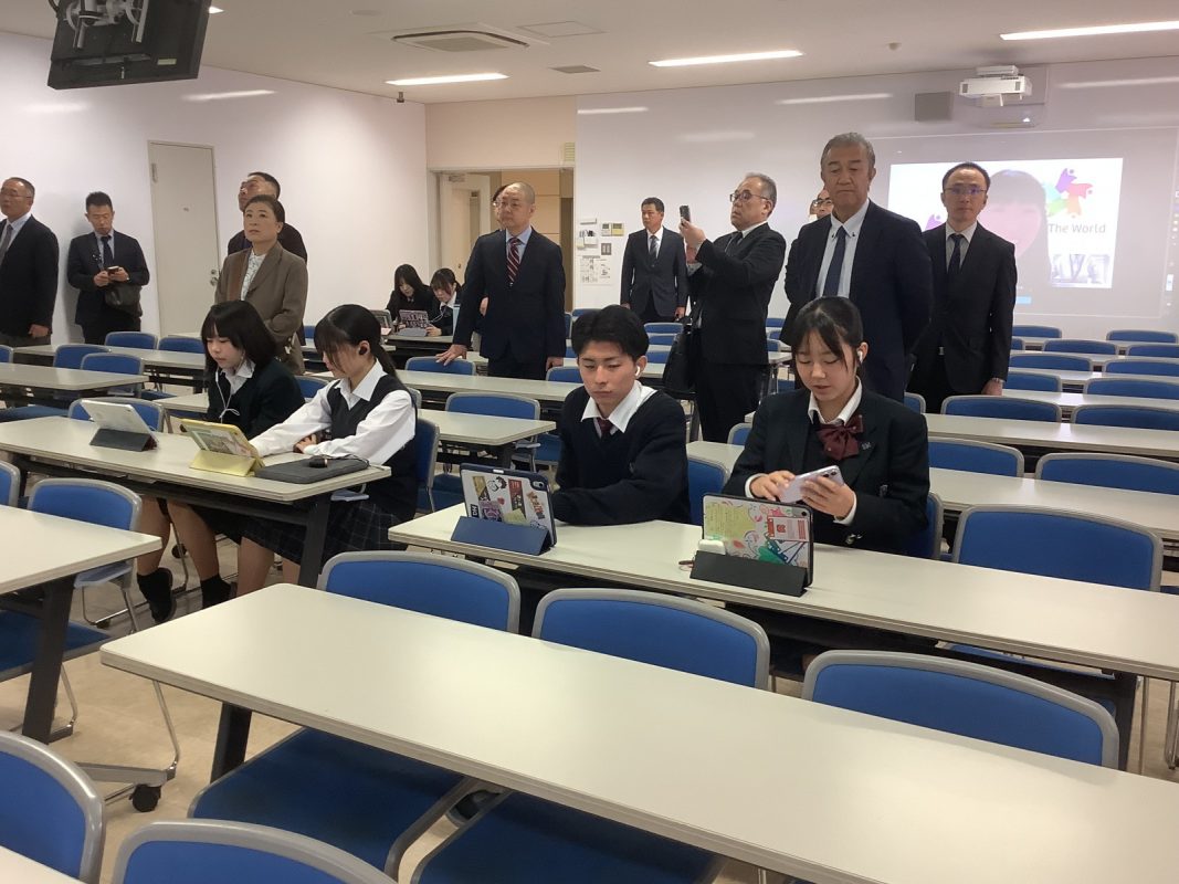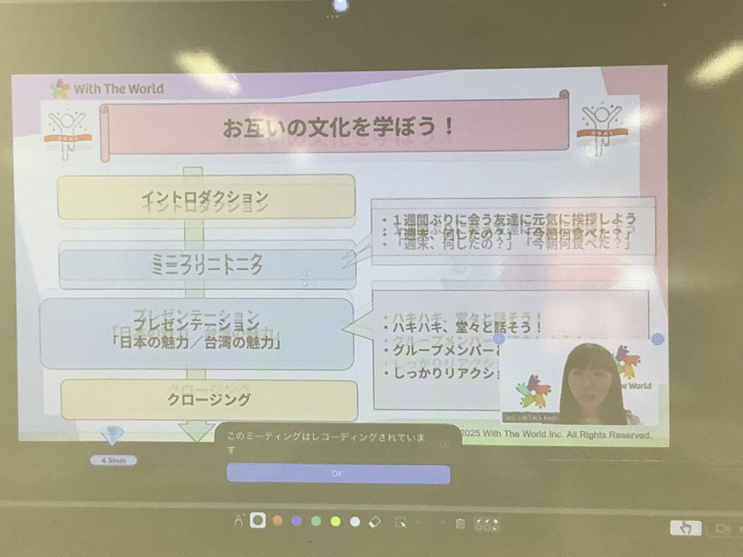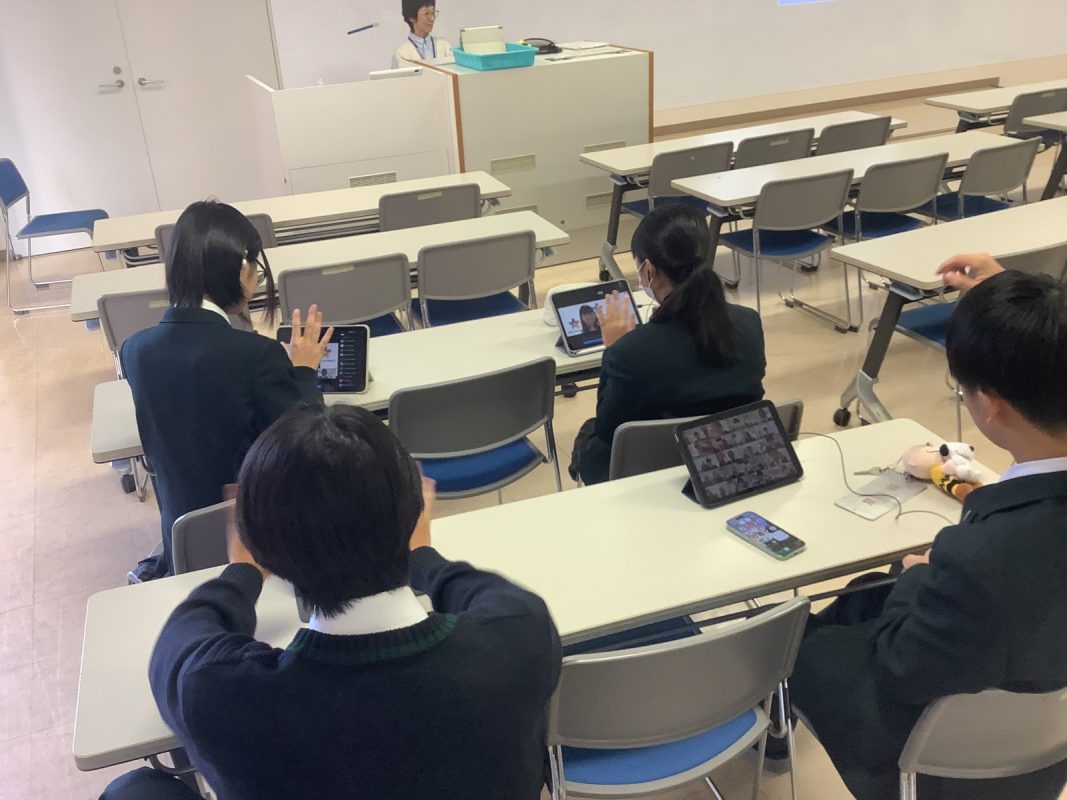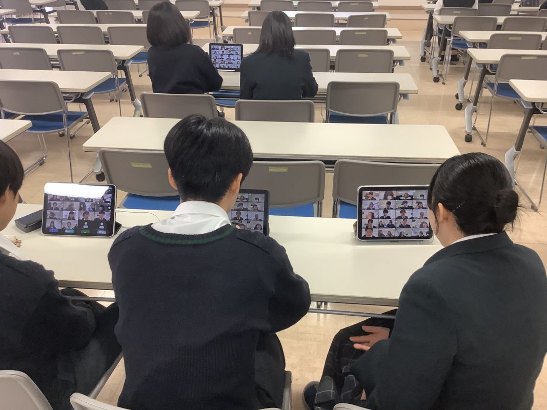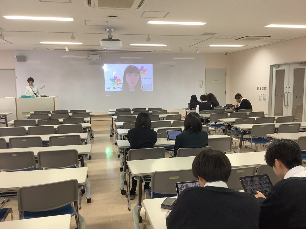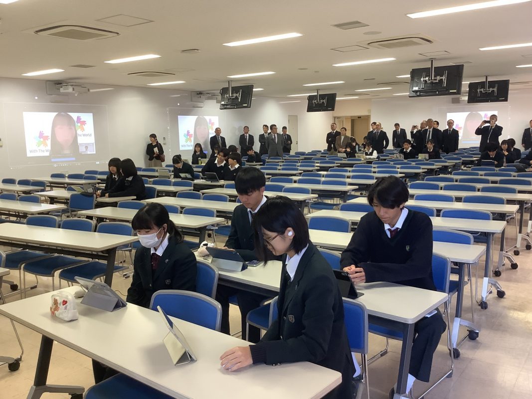 2025年11月14日(金)探究の授業の時間内に,with the worldの団体を介して,海外オンライン交流で,台湾の学校の生徒と,ブレイクアウトルームを使って,グループごとの交流を行いました。8グループに分かれて,オンライン交流を行いました。MoG修学旅行で,インドネシアバリ島での経験を報告する場面もありました。大きな教室に8グループ分散して,ハウリングしないようにZOOMに繋ぎました。機材トラブルなどなくスムーズに44名の生徒たちは,オンライン交流で,英会話を行なっていました。当日,愛知県の学校から見学に来られていましたので,授業風景を見ていただきました。