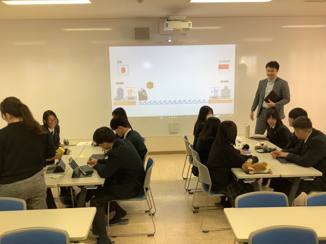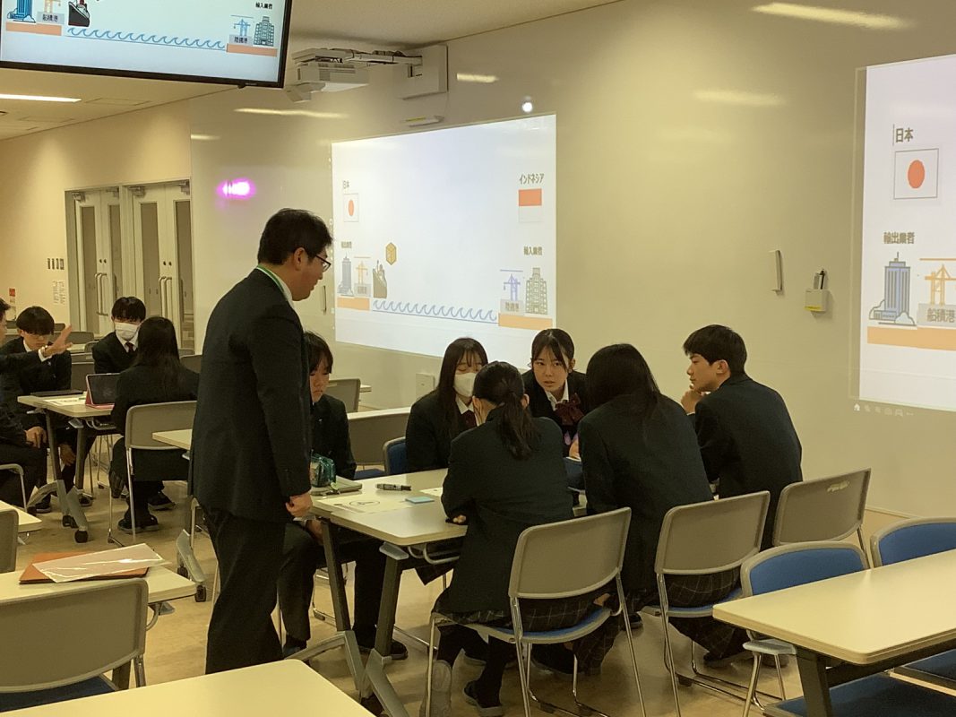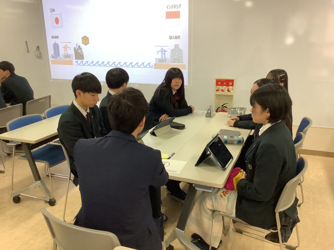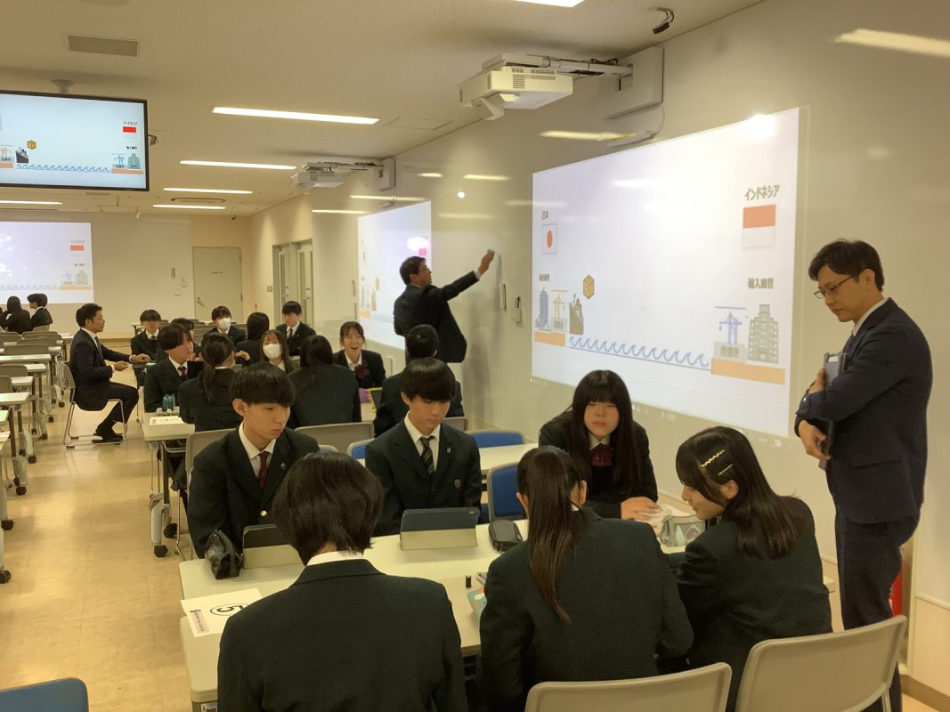 2026年1月9日(金)2限,グローバル探究コースの探究のじゅぎょうで、SMBC銀行の方によるMoG研修後の日本とインドネシア間の貿易について,お金の動きと商品の動き,為替などについて、各グループごとに銀行の方がファシリテート役のワークショップ形式で授業を進めました。生徒たちも初めての試みで,少し最初は緊張していたようですが,ワークショップが進むうちにワークショップのディスカッションが白熱していました。以下がその様子です。