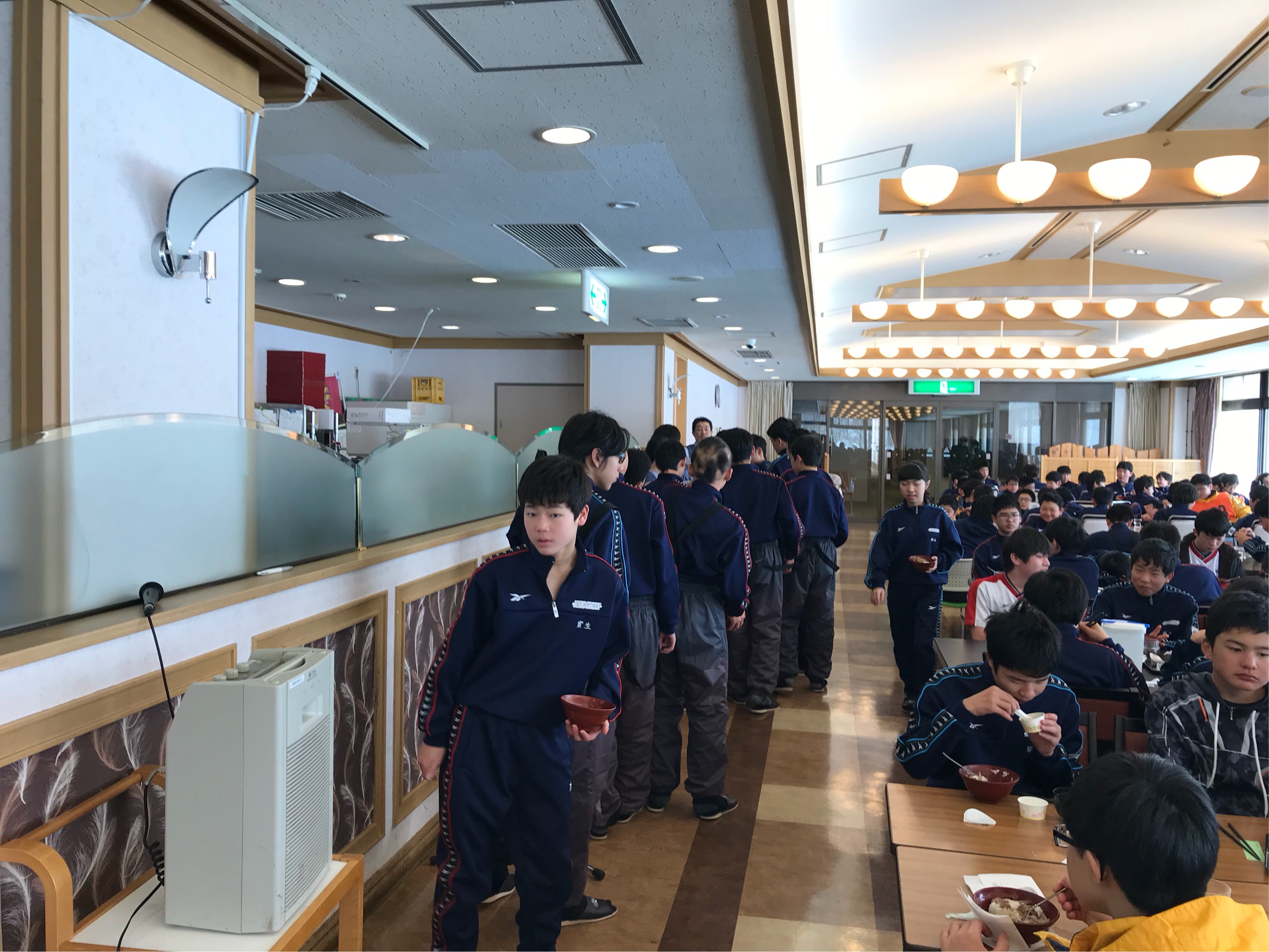 午前の練習後、ホテルに帰る道は一般のお客様もいるので道の端を列になり帰りました。昼食の牛丼は昨日のカレーに続きおかわりの長蛇の列ができました。2日目午後の練習は予定通りリフトで上まで行きました。天候も回復してしっかり滑れました。今日も夕方はリクリエーションと入浴を並行でしました。2年の実行委員が賢明に仕切ってくれました。