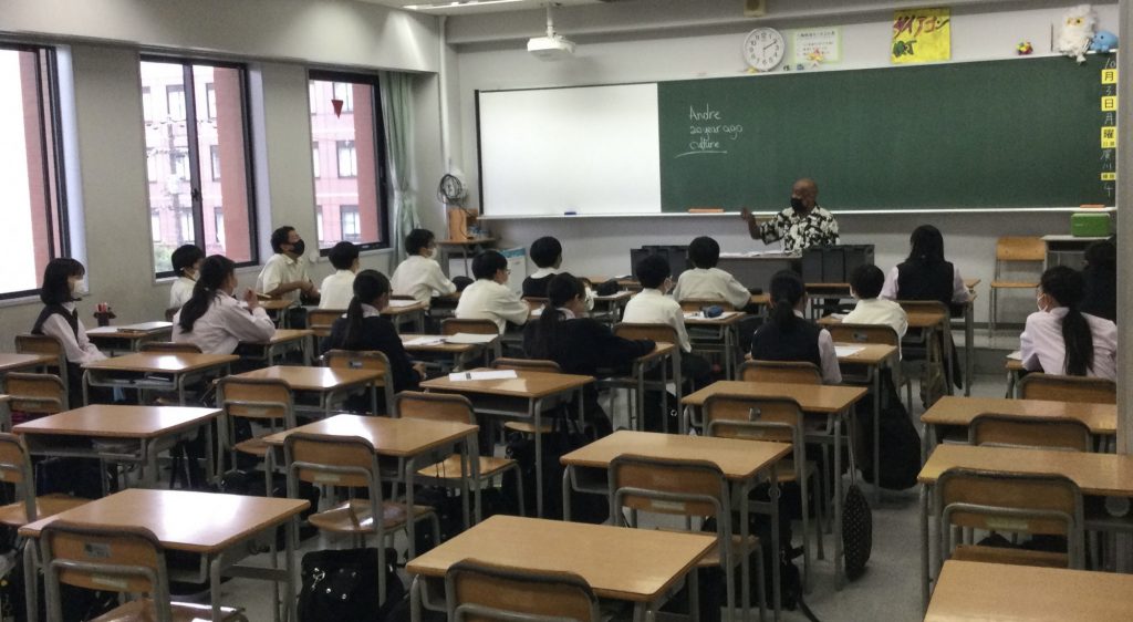 2022年10月3日(月)5限6限の時間帯に10月からの英語コミュニケーションプログラム1回目,本館5階第1特別教室で開講式を行いました。 1年 1組から4組までの生徒たちをクラスを解体して,8つ(AグループからHグループ)のグループに分けて各教室でのレッスンに移りました。はじめてのネイティブ講師で,中学1年生の反応も良く,グループ発表の時も大盛り上がりでした。これから約半年間のレッスンが楽しく学べることを期待しています。