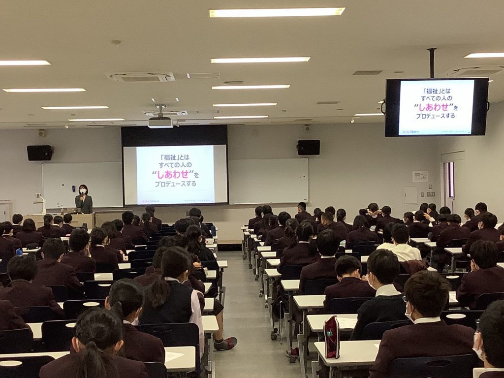 2022年11月14日(月)5限6限の時間帯に,本館5階 第1特別教室で,広島国際大学健康科学部 医療福祉学科 岡本晴美先生が,社会福祉ってなーに?というテーマで,生徒たちにわかりやすく説明してもらいました。