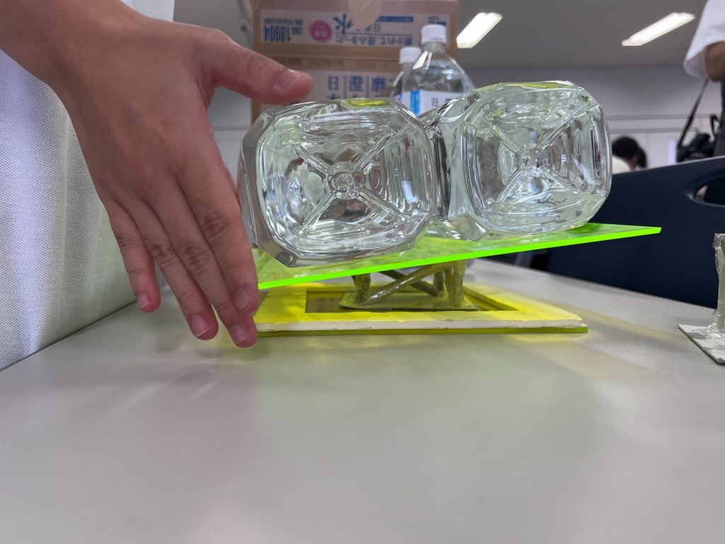 ストローで作った模型の上に、2リットルのペットボトルを乗せていき、建物が何本で壊れるのかを実験します。