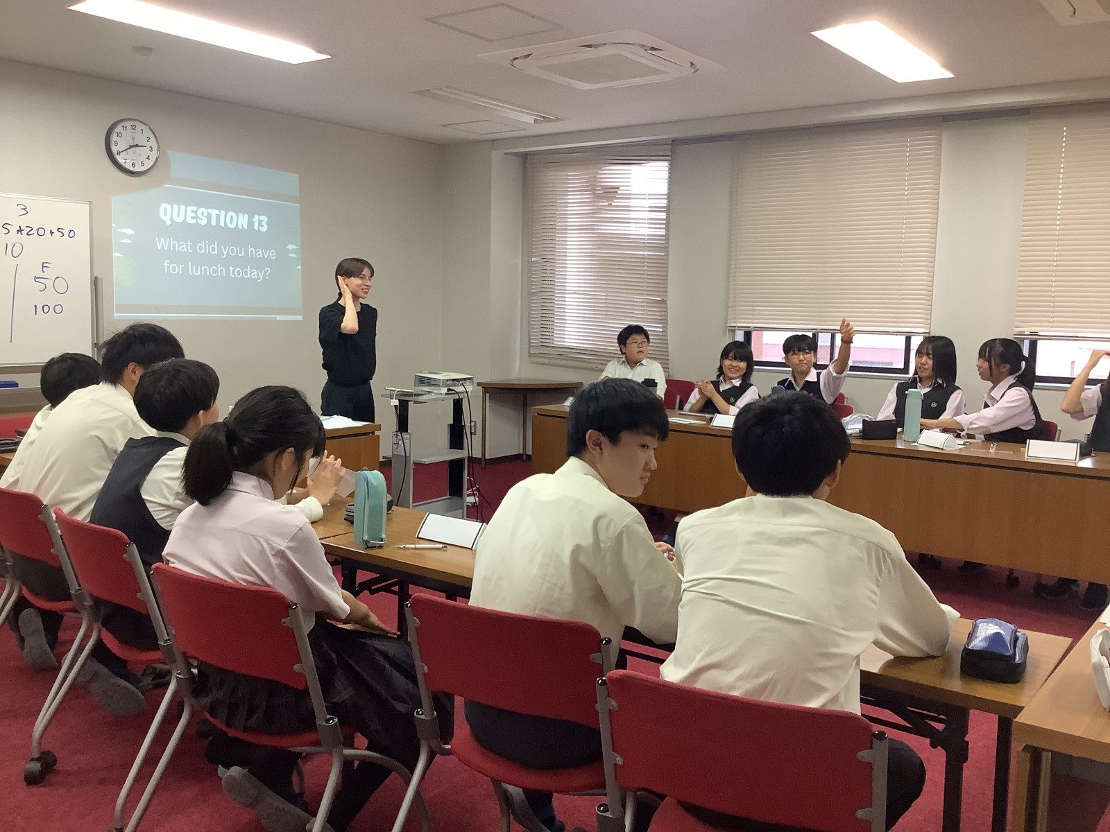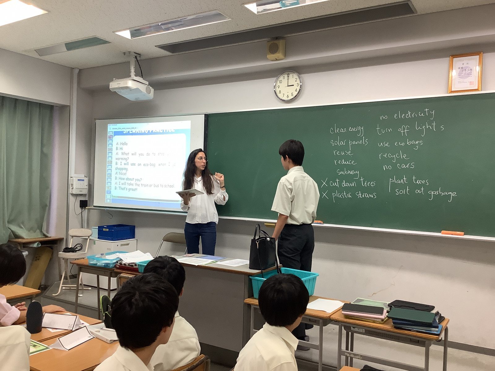今日は初めに、英語の動画教材を通して地球温暖化の現状に関する情報を把握し理解を深めました。その上で、温暖化の進行を食い止めるために私たち一人ひとりが実行できる具体的な行動策について考察を深めました。