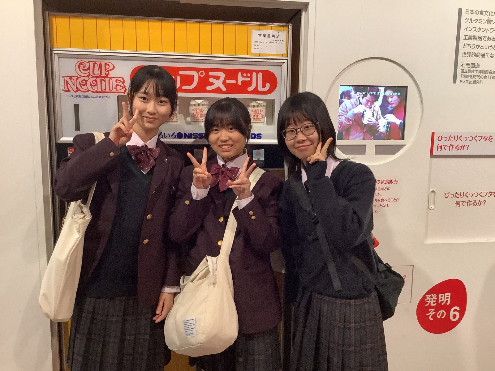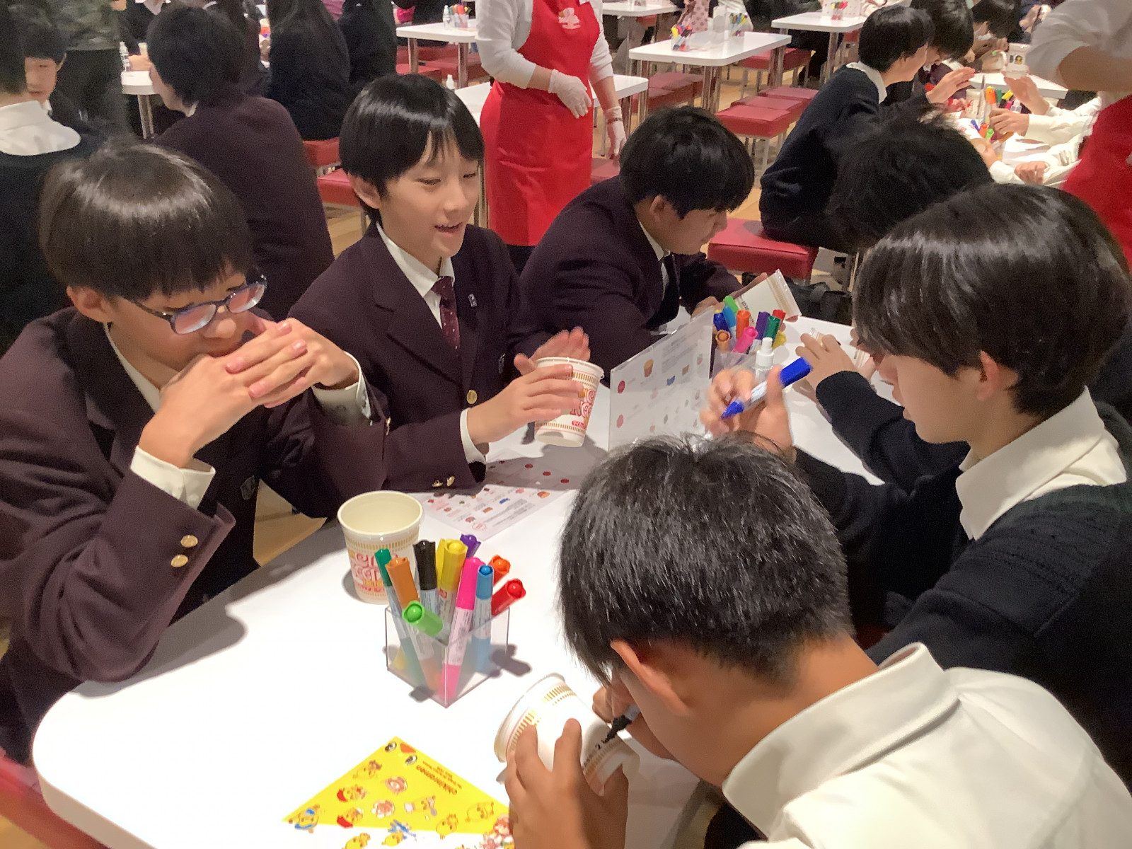 中学2年生は、午前中にカップラーメンミュージアムに行き、マイカップヌードル作りを体験しました。生徒たちは個性豊かなデザインをカップに描き、好きなスープや具材を真剣に選んでいました。