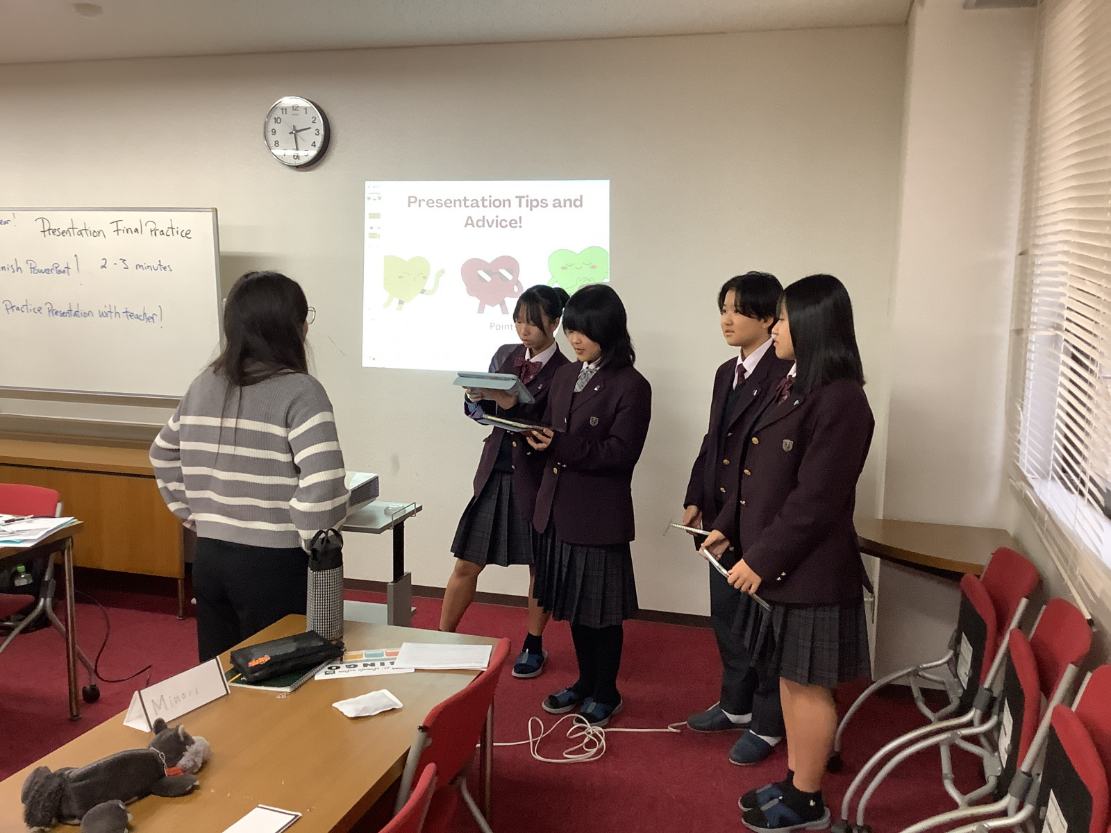 来週のプレゼンに向け、資料の作成はもちろん、原稿の暗記、ネイティブの先生にもチェックしてもらいながら発音の練習等も行いました。