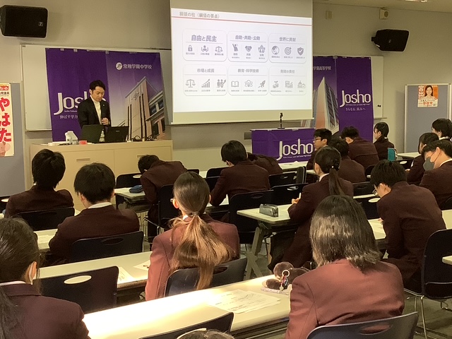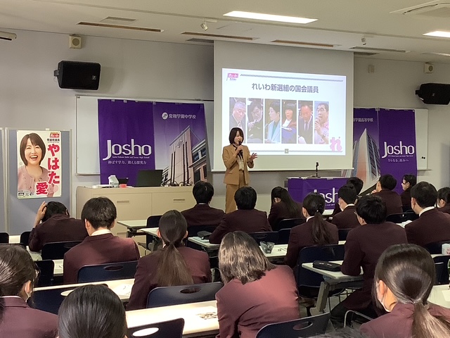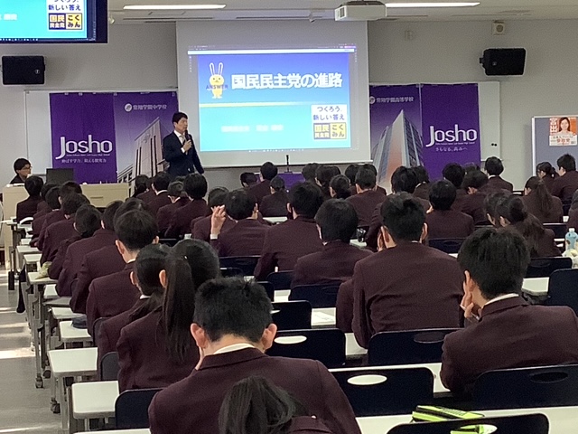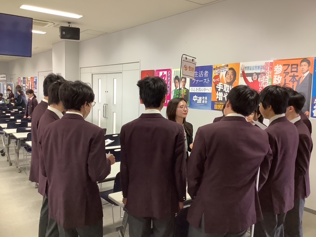 学年の選挙管理委員を中心に準備や事前学習もして今日に臨みました。各国政政党にお願いしておりましたが、先週選挙が終わったばかりで大変お忙しい中8名の政治家の方々に来校していただきました。議員さんからマニュフェストまたは党の綱領の解説を聴き、加えて目前の議員さんとディスカッションをしてから最後は生徒が候補者を選んで投票しました。