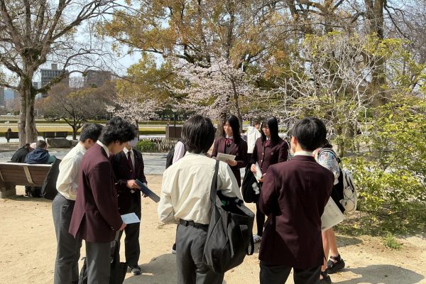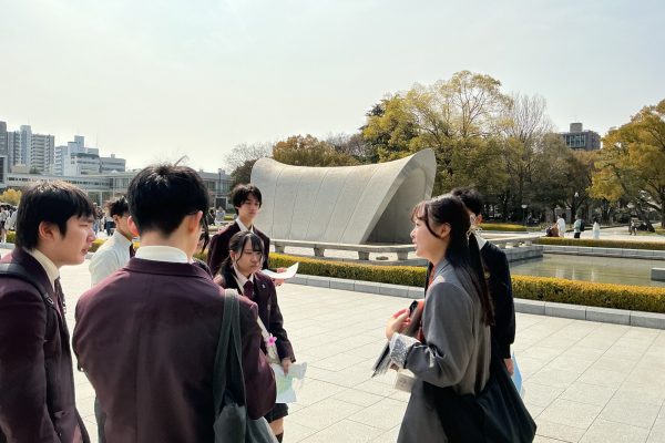 午後からは広島平和記念資料館を見学し、戦争の歴史や平和の大切さについて理解を深めました。その後のピースパークツアーでは、現地バディの方の案内のもと広島平和記念公園を巡り、被爆の実相や平和への願いについて学びました。生徒たちは真剣な表情で展示や説明に向き合い、それぞれが平和について考える時間となりました。