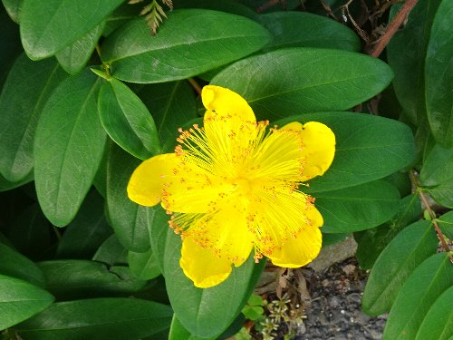 手前の花は、ヒペリカム ヒドコート(大輪金糸梅)という最近よく見かける園芸品種です。