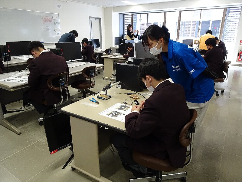常翔キャリアアップチャレンジの「中大連携プログラム」大学体験を実施しました。今回中学1年生は、大阪工業大学のものづくりセンターの全面的な協力を得て、工作体験(電子工作、ガラス細工、木工細工、金属加工、陶芸、石材細工など)と大学が取り組んでいるモノラボプロジェクトの説明・見学という内容でした。すべてが初めての体験で真剣に取り組んだり、見聞きをしていました。2年生は摂南大学農学部食品栄養学科教授、運動生理学教室の藤林先生による「運動とこころの関係」と題しての講義と体験でした。私は中学1年生の体験を覗いてきましたが、これだけの体験を一度に実施できるのは、大阪工業大学工学部ならではで、生徒たちにとっては貴重な体験になったと思います。今回の体験がきっかけで、ものづくりに興味がでて勉強へのモチベーションにも繋がればと願います。