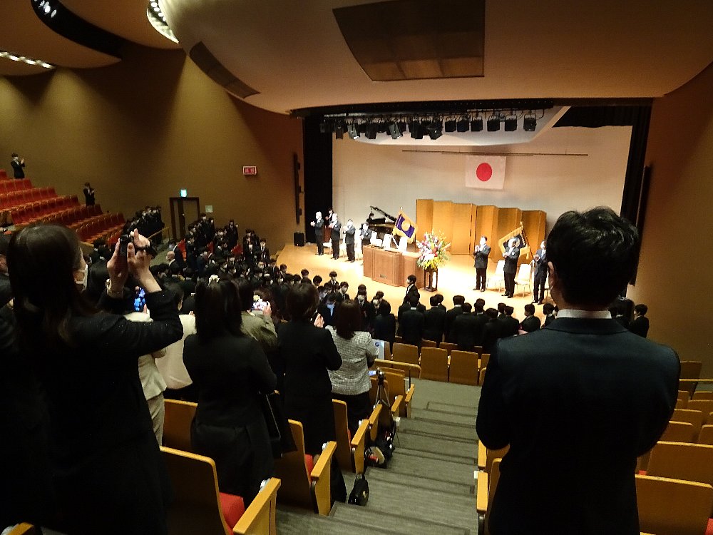 中学校9期生の卒業式をOITホールで挙行しました。昨年同様、コロナ禍ということで人数制限はしたものの保護者の方に参加してもらうことができました。在校生もクラス代表だけですが参列してもらいました。例年なら最後に卒業生が壇上で卒業の歌や校歌を合唱したりしてくれ感動するのですが、それがこの3年できていないのがなんとも残念でなりません。来年こそは実施できることを願っています。式は、厳粛な雰囲気で実施することができ生徒たちの成長が実感できる式になりました。終了後は全員で記念写真撮影、その後ホールに戻って、先生や生徒たちが作成した3年間の行事等の映像鑑賞、先生方への感謝のメッセージ動画、担任団への花束贈呈、各担任副担任からのメッセージなどで締めくくりました。先生方のあたたかい熱い思いが伝わる式となりました。今日の日をこれから始まる高校生活に向けて、さらに力強く一歩を踏み出す「飛躍」を誓う日になることを願っています。