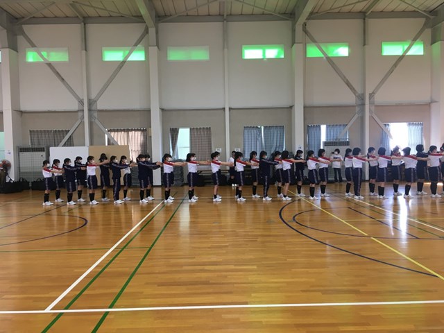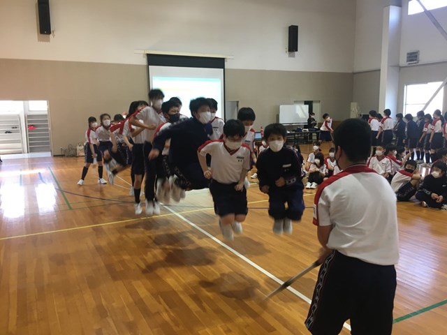 到着後すぐにホテル前の広場で昼食を摂りました。青空の下でご飯を食べる事はなかなかなく、原則食事は黙食でしたがとても楽しそうでした。その後、体育館に集合し、開校式、全体写真、セルフチェックシート、集団行動、クラス対抗大繩大会と続きました。中学に入学して初めての長時間にわたる団体行動で、緊張しながらも大変楽しそうでした。大繩跳びは慣れていないからか、どのクラスも最初の1回がなかなか飛べませんでしたが、一度でも飛んだチームからは歓声が起こっていました。