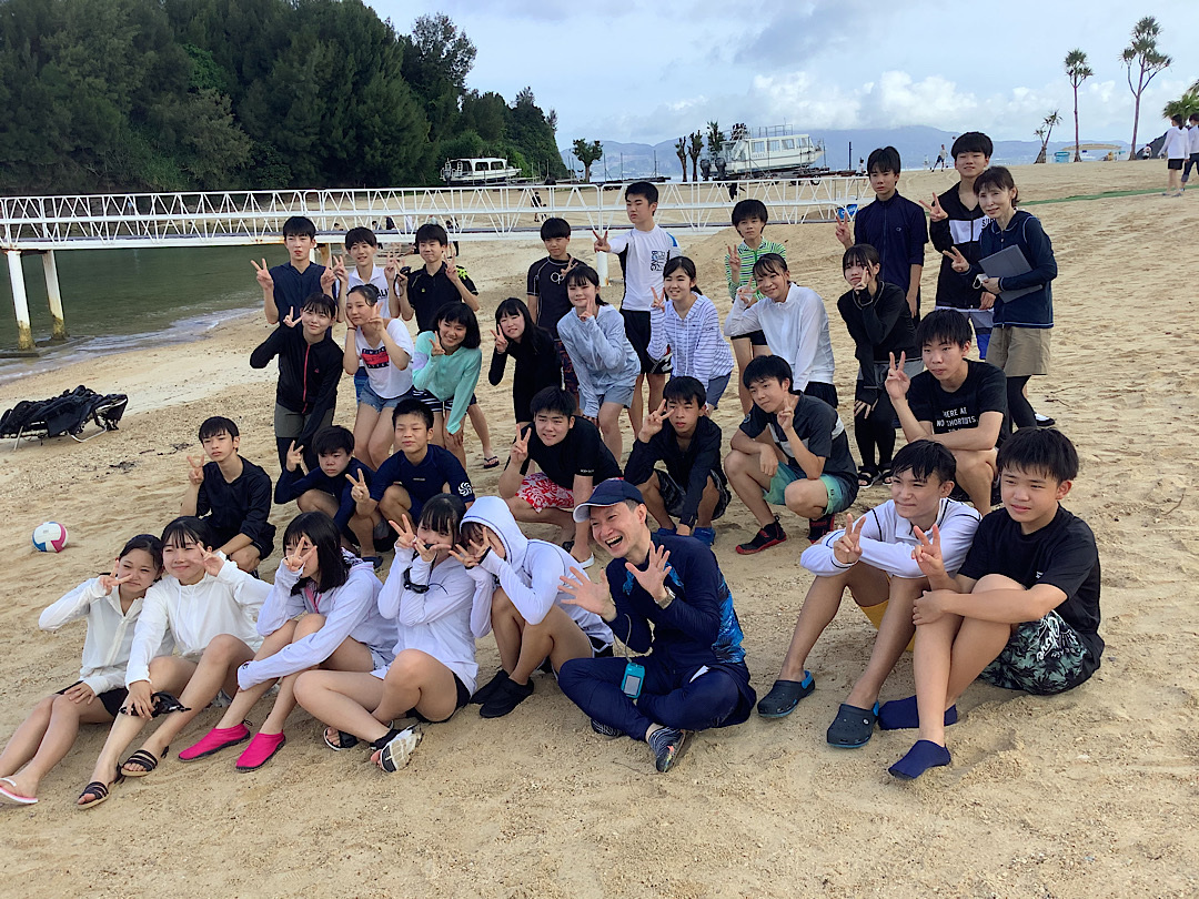 午前中は水着に着替えて、シュノーケリングやバナナボートなど楽しみました。また、海に行かない生徒たちは、万座毛で美しい景色を見た後、琉球村ではシーサーの絵付け体験をしました。