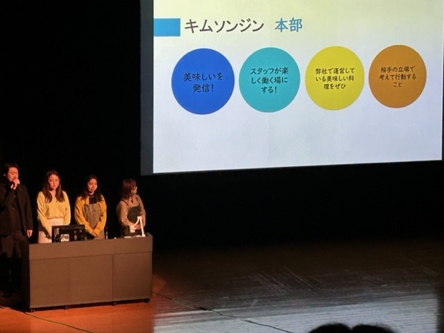 今回は関西大会という事で、三興工業様、G.O.A.Tグループ様とファーストオーシャン様の3チームが出場し、自分たちの仕事への想いやこだわりをステージ上で熱く語りました。どの企業の方も、ちゃんと仕事への想いを持っており、それをチームで語る事ができるのは素晴らしい事だと思いました。生徒たちも企業の方の熱い語りに感動していたようです。このようにカッコいい大人を見る事で、仕事をするのはすばらしいと、未来に対して肯定的に捉える良い機会だなと思いました。自然発生的に拍手や手拍子が起こり、大変和やかな会となりました。