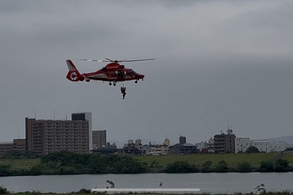 会場では防災に関してにいろいろな演習が行われて、本学園も土嚢作りに参加しています。本校からは薬学医療系進学コースの3年生たちが参加し、ヘリコプターを使った救助訓練や、水害での救助訓練などの演習を見学させてもらったり、防災に関するいろいろな体験コーナーに参加させて頂きました。