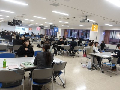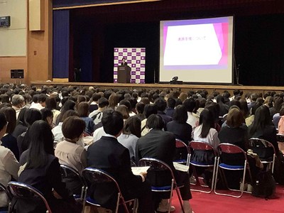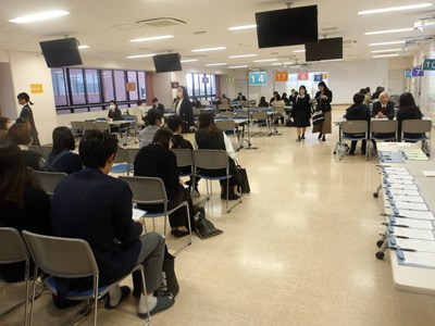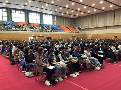 この日は、天気にも恵まれ、大変多くの方にご参加いただきました。第2、3回の説明会は、東館ではなく総合体育館で実施していますが、過去最多に近い766組約1600名もの方にご参加いただきて、広い1階席が満員になり、2階席にも座って頂きました。