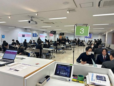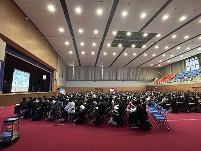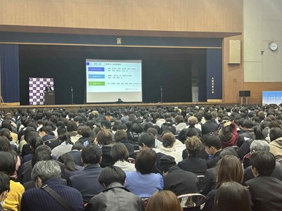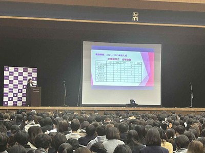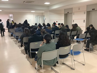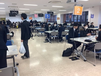 今年最後の説明会となりました。12月になり、急に寒くなりましたが、天気にも恵まれ、大変多くの受験生と保護者の方にお越しいただきました。会場となった総合体育館は満席で、2階席にも座って頂いたので、おそらく1400名は越えたものと思います。もちろん部活動の見学も多くの希望がありましたが、この時期は個別相談が非常に多くなり、会場は外のエレベーターホールにも特設待合室を作らせて頂きました。
