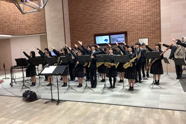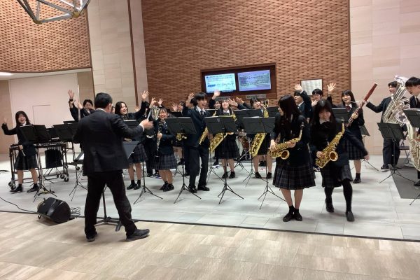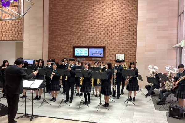3月の定期演奏会に向けて、今日の昼休みに高校吹奏楽部が北館エントランスでミニコンサートを開催しました。