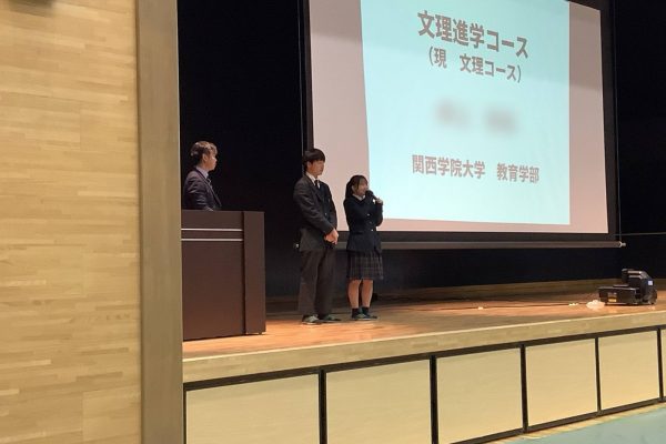 冒頭、私からの挨拶では、3年間の高校生活を送るうえで大切にして欲しいこととして、①自ら学ぶという主体性、②お互いを尊重して自分の行動に責任を持つ、③将来の目標をつくる、④失敗を恐れずチャレンジする、⑤自分の好きな事、得意な事をとことん伸ばすという5つの事を説明しました。その後、特進系コースと文理コースから1名ずつ卒業生に3年間の経験について話をしてもらいました。
