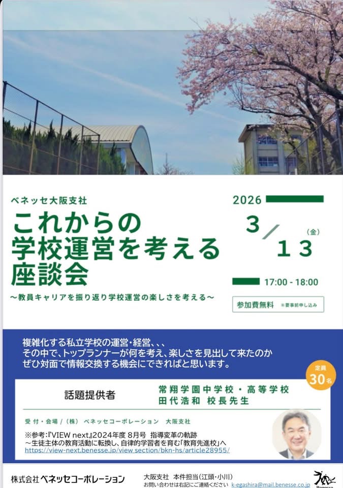 ベネッセ主催で、私の講演会を開催して頂きました。元は本当に普通の教員だった私が、全国の先進的な教育者と接するうちにどんどん変化し、気がついたら関西のリーダー的な教員になっていたというストーリーが興味深いので、講演会をしませんかとお誘いを受けたのがきっかけです。