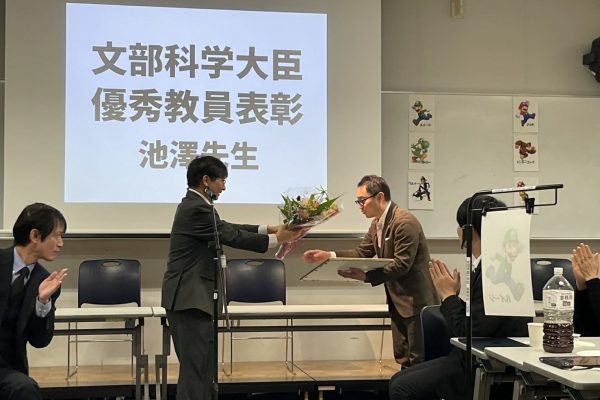 文部科学大臣優秀教員表彰を受けられた社会科の池澤先生、大阪府の私学教育功労者表彰を受けられた理科の花本先生、本校独自の賞であるJOSHO TEACHER OF THE YEARを受賞された英語科の庄司先生、男子バレーボール部顧問の先生方を表彰し、退職される先生方に花束をお渡ししました。実は私も今年度末で校長を退任するので花束を頂き、最後に少し長めの挨拶をさせて頂きました。挨拶は10分でと言われたのですが、やはり40年勤務した学校なのでさすがに10分では足りず、気がつけば17分もお話してしまいましたが、最後は感無量でした。また実行委員会が「VS校長」という企画を作ってもらい、4つのゲームを行い、私と他の参加者の先生方がゲームで競いました。さらに、最後のチーム対抗マリオカートにも参加して、私は終始ステージにいた感じですが、本当に楽しく、良い思い出になりました。実行委員会の皆さま、こんなステキな企画を考えてくださり、本当にありがとうございました。